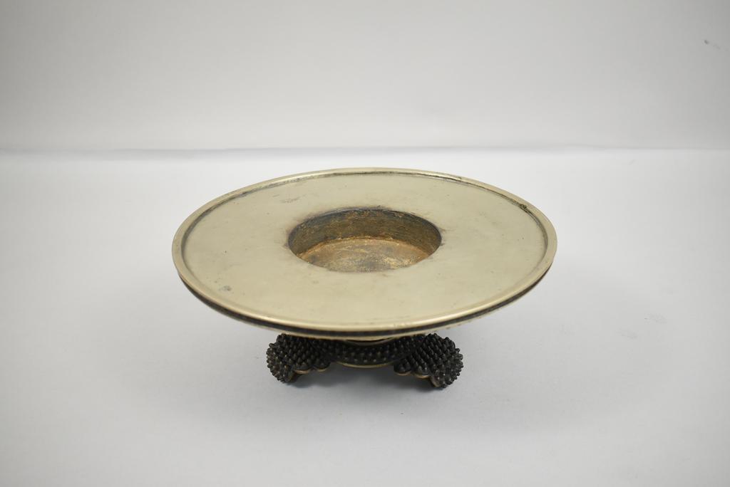 Japanese bronze Usabata. Circular Ikebana dish on stand with studded exterior. Se Min Ju signature. 4 3/16" x 10 1/2".