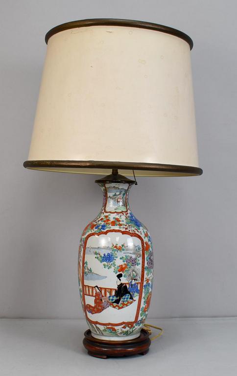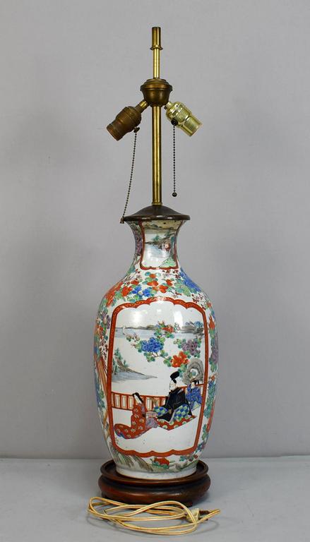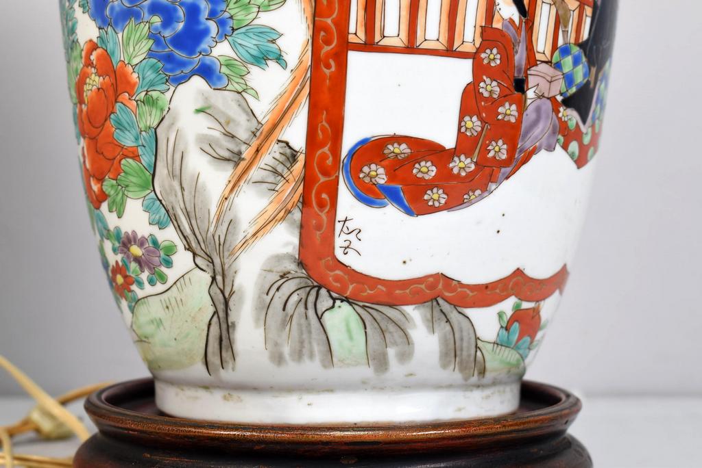 Japanese polychrome porcelain vase turned table lamp. With figures and phoenix decoration. On wood base. Vase: 17" tall.