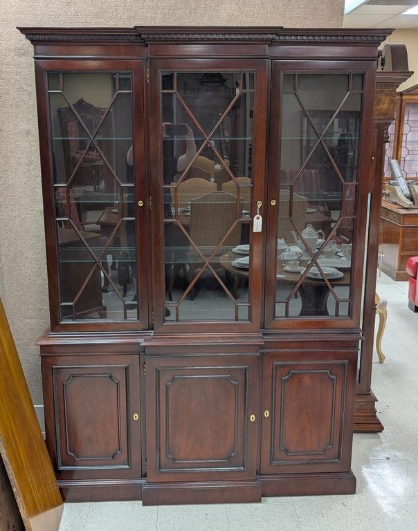 Kindel Mahogany Breakfront China Cabinet With 3 Glass Doors, 3 Lower Doors With Shelves And Drawers.