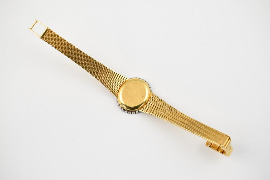 Ladies' yellow gold wristwatch marked Omega De Ville with 18K gold band. Dial surrounded by approx. approx. 30 diamonds. Marked 750 DA 582.1000. 44 grams total.