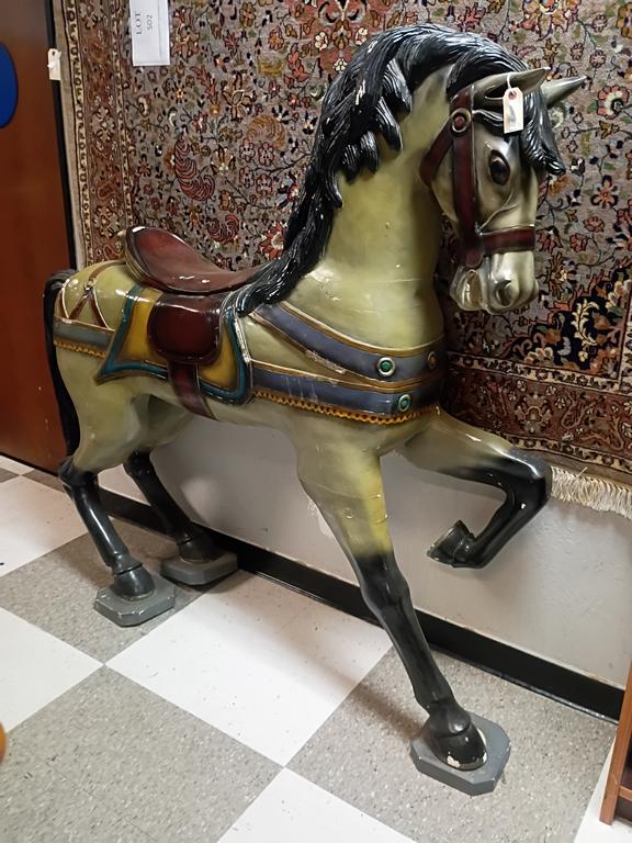 Large Composition Carousel Horse. Painted In Various Colors, Back Of The Saddle Depicting A Bird's Head. 64" X 60.5". (Some Losses).