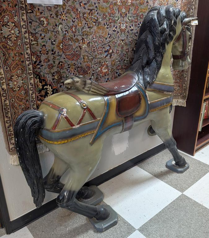 Large Composition Carousel Horse. Painted In Various Colors, Back Of The Saddle Depicting A Bird's Head. 64" X 60.5". (Some Losses).