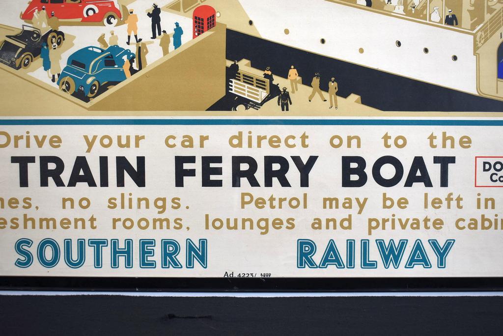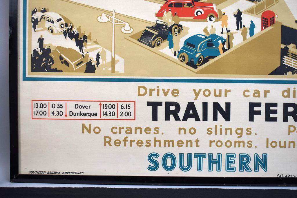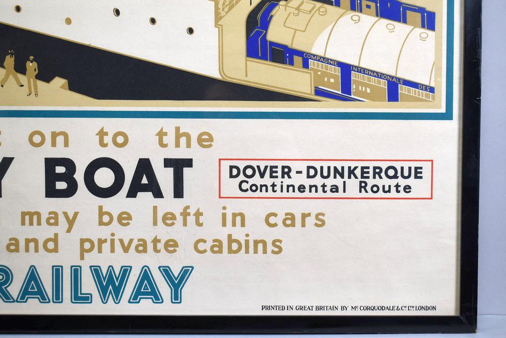 Leslie Carr Dover - Dunkerque color lithograph poster. Southern Railway Advertising Poster, Train Ferry Boat, Dover Dunkerque continental route. Printed in Great Britain by McCorquodale & Co. Ltd. London. Framed, overall: 41.5" x 51.5".