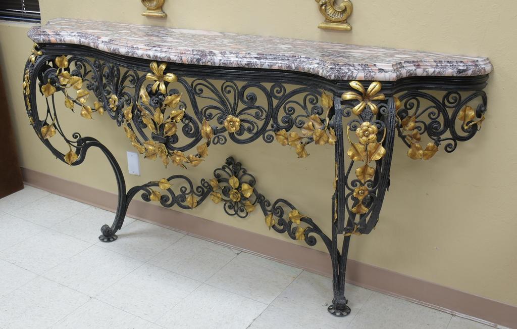 Louis XV style metal and marble top console table and mirror. Wrought iron base with gilt painted flower and leaf decoration with marble top (75"x 20" x 38.5"); Ornate gilt carved mirror with exquisite floral and scroll crest (68" x 37").