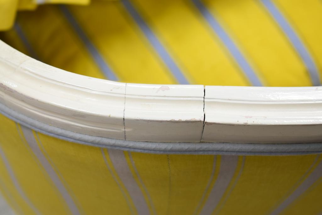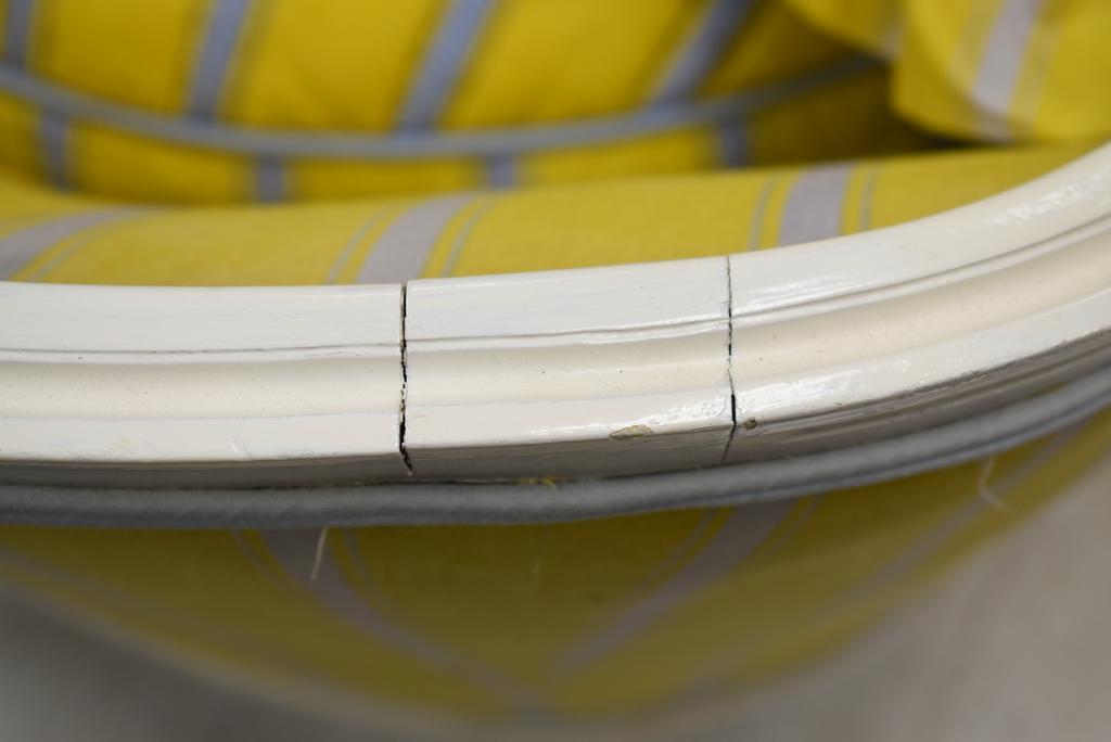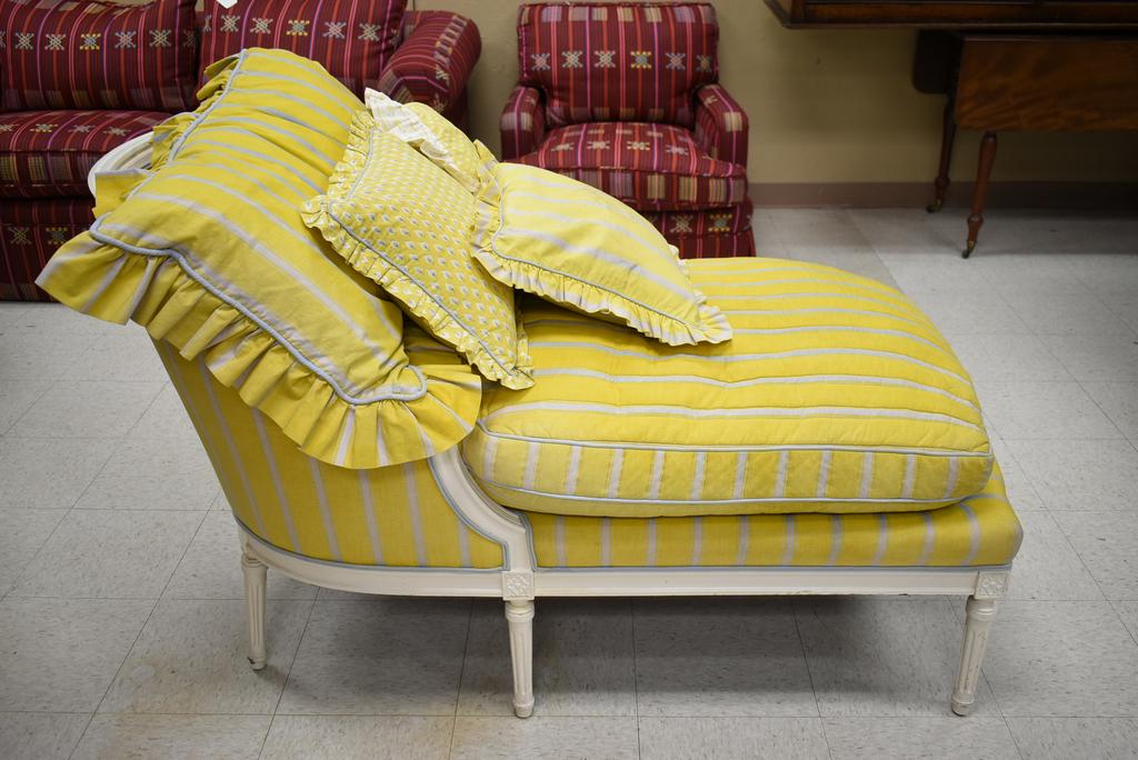 Louis XVI style chaise lounge. White painted frame with striped yellow upholstery and cushion. Approx. 56" L, 34.5" H.