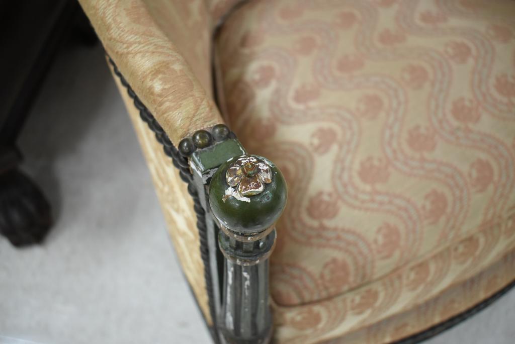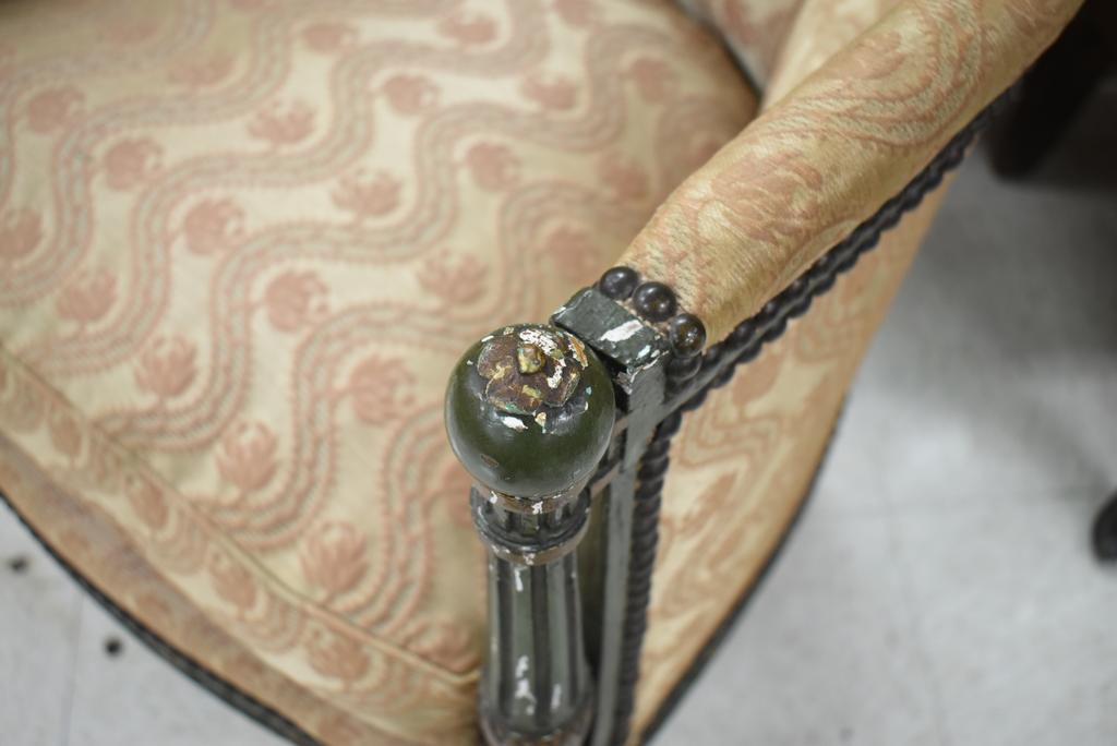 Louis XVI style green painted and upholstered parlor chair. 36 1/2" tall.