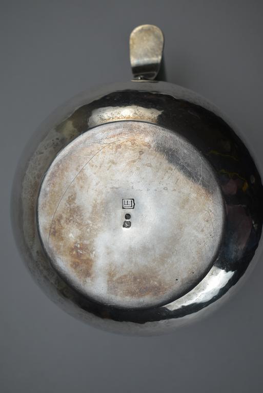 Luiz Ferreira Portuguese .833 Silver pitcher. Hand hammered pitcher with jade handle. LF and Eagle 833 marks. 5 1/4" H, 7" x 5". 13.3 troy oz total.