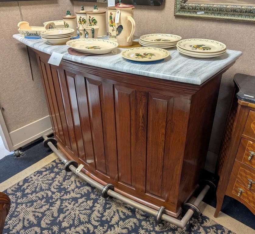 Mahogany Demilune Bar Unit. Gray Marble Top, Brass Foot Rail. 62.5" W, 26.5" D, 43" H.