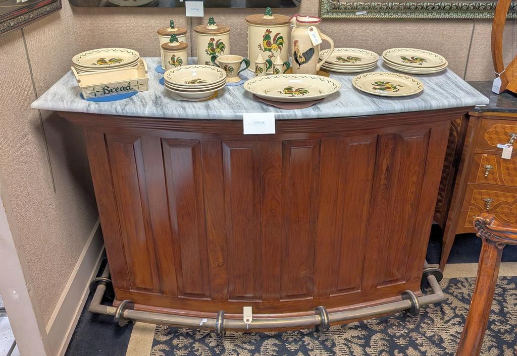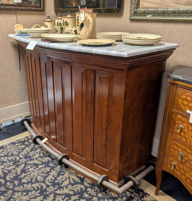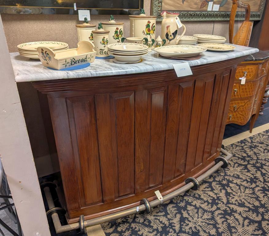 Mahogany Demilune Bar Unit. Gray Marble Top, Brass Foot Rail. 62.5" W, 26.5" D, 43" H.