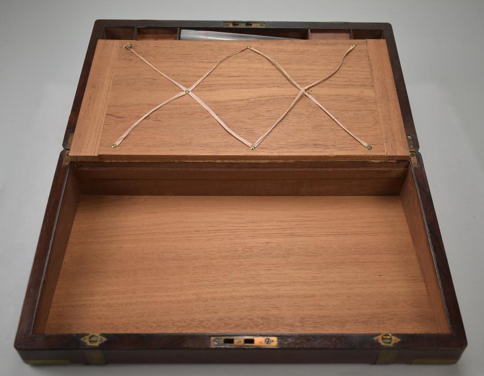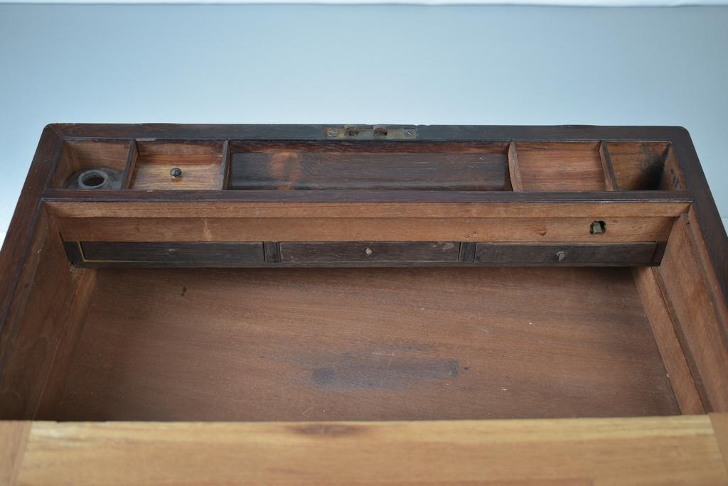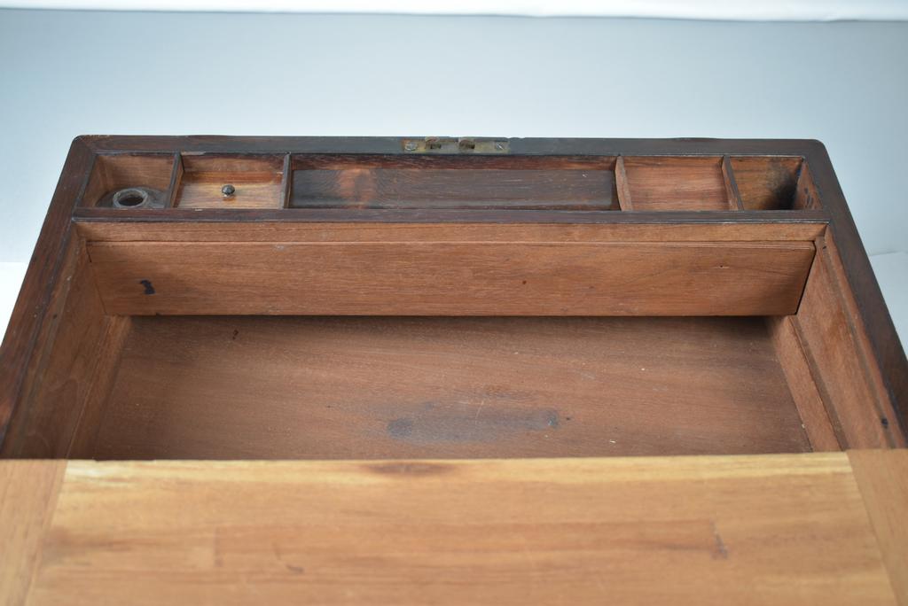 Mahogany portable writing desk on stand. Interior with 2 leather inset slopes with compartments beneath. On stand. Overall: 18 1/4" W, 10 1/2" D, 19 3/4" H.