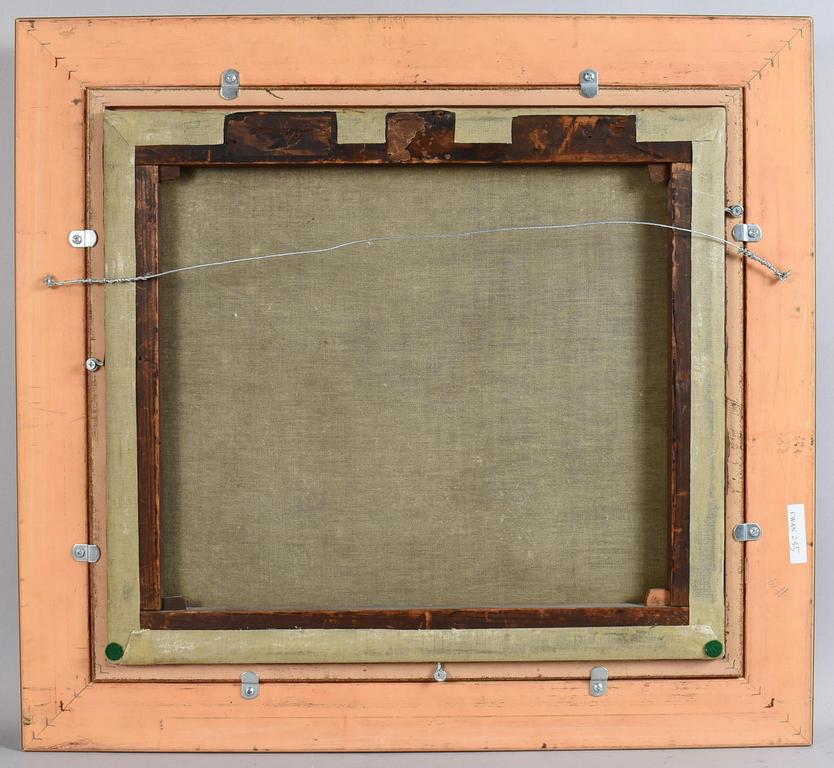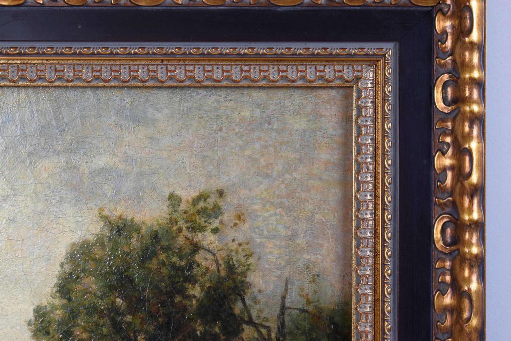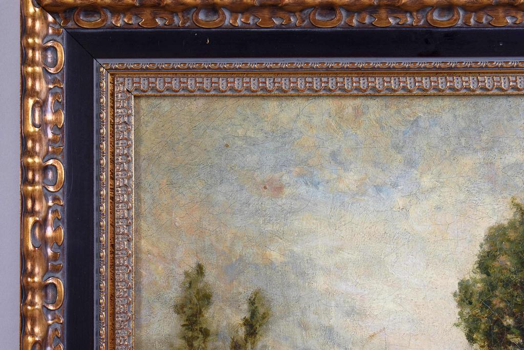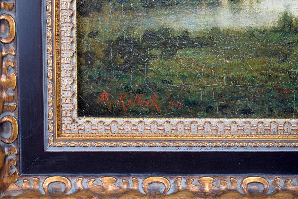 Mary Kollock (1840 - 1911), Oil on canvas, Lake scene with trees and city line in the background. Signed lower left M. Kollock '84. 16" x 18". Framed, overall: 21 3/4" x 23 1/2".