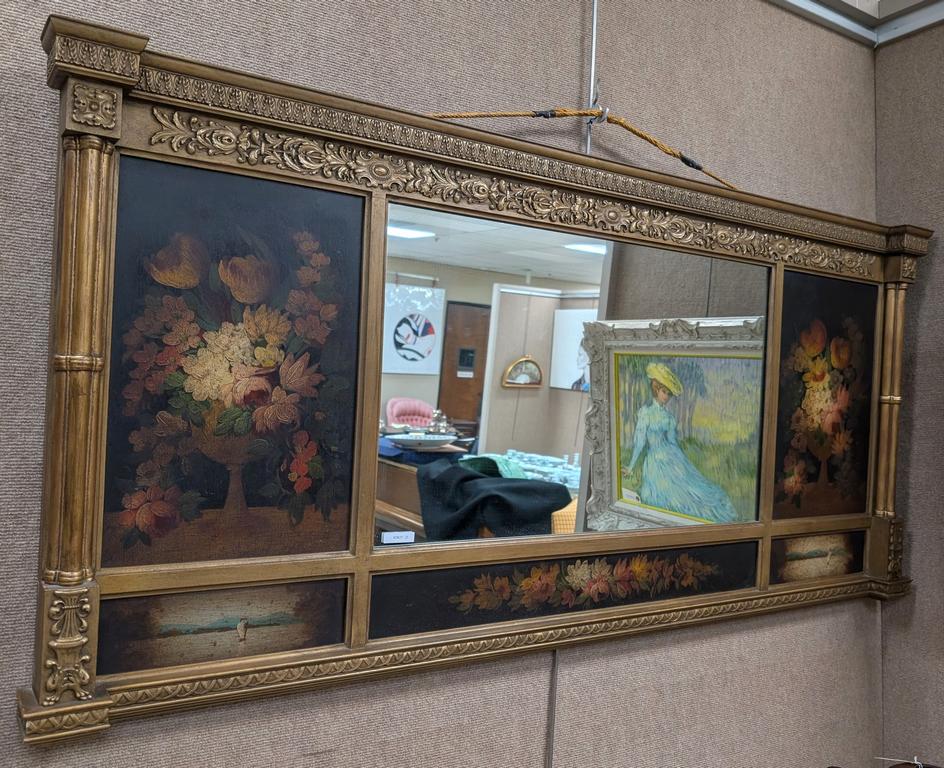 Mid 20th C. Gilt Wood And Composition Mirror With 2 Painted Floral Still Life Panels. 28" X 58".