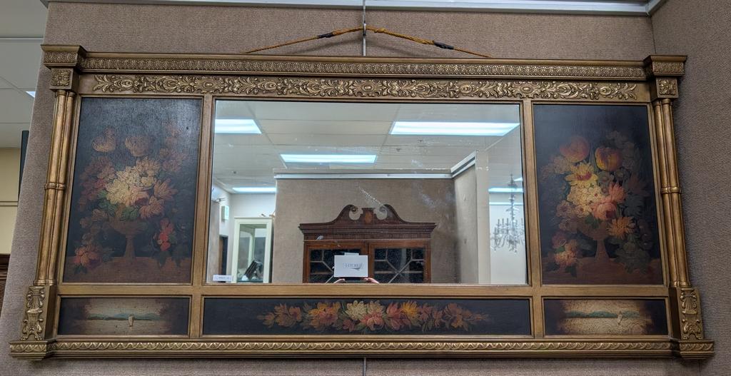 Mid 20th C. Gilt Wood And Composition Mirror With 2 Painted Floral Still Life Panels. 28" X 58".
