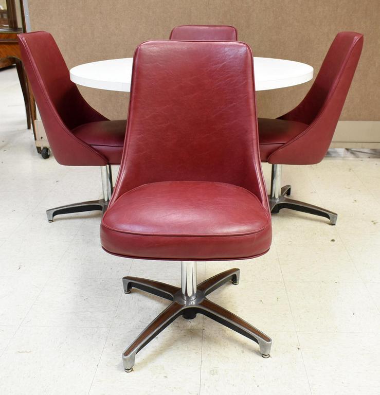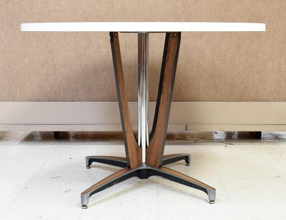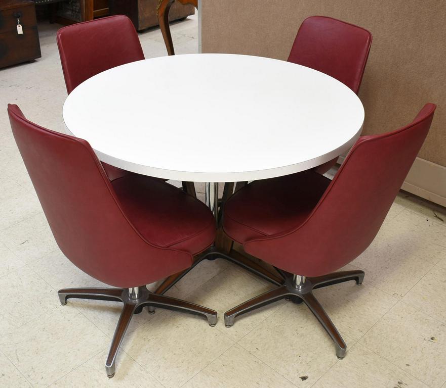 Mid Century modern white laminate circular table with 4 Chromcraft vinyl upholstered chairs. Table: 41.25" x 29".