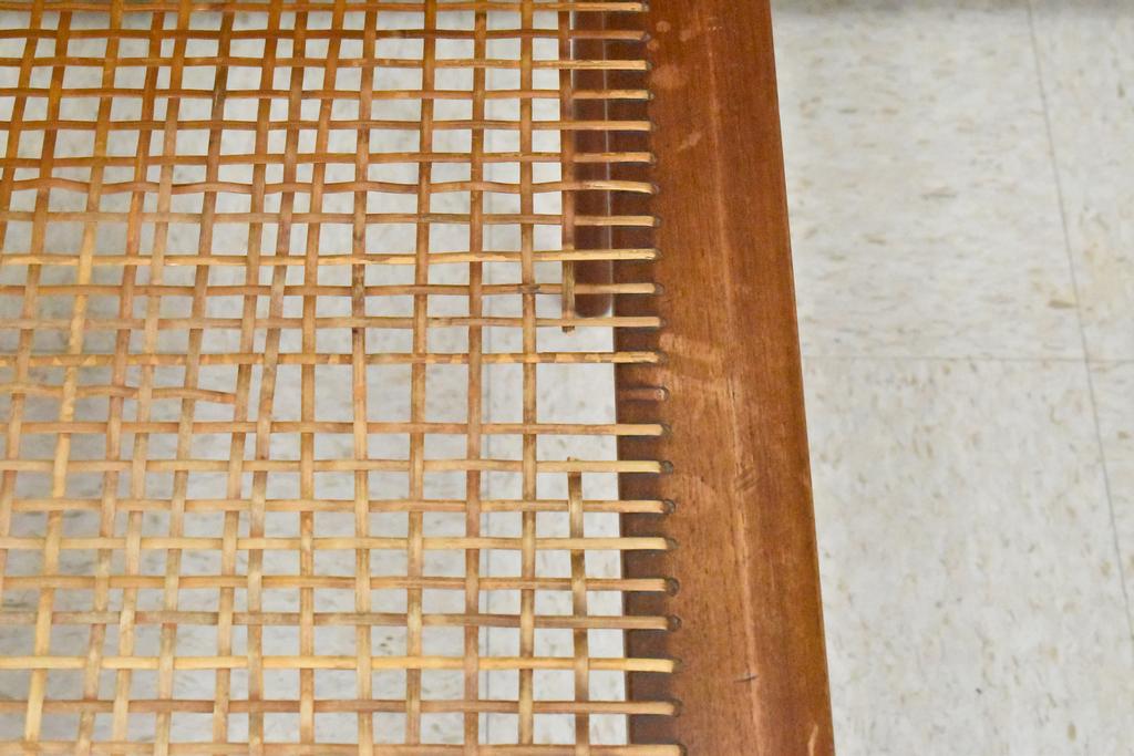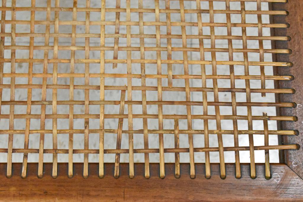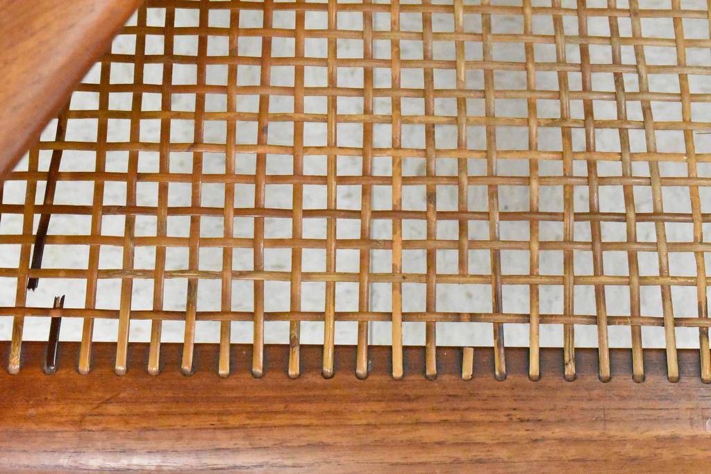 Mid century teak Minerva style side table. Two tier table with teak top and wicker shelf. 30.5" W, 30.5" D, 25" H.