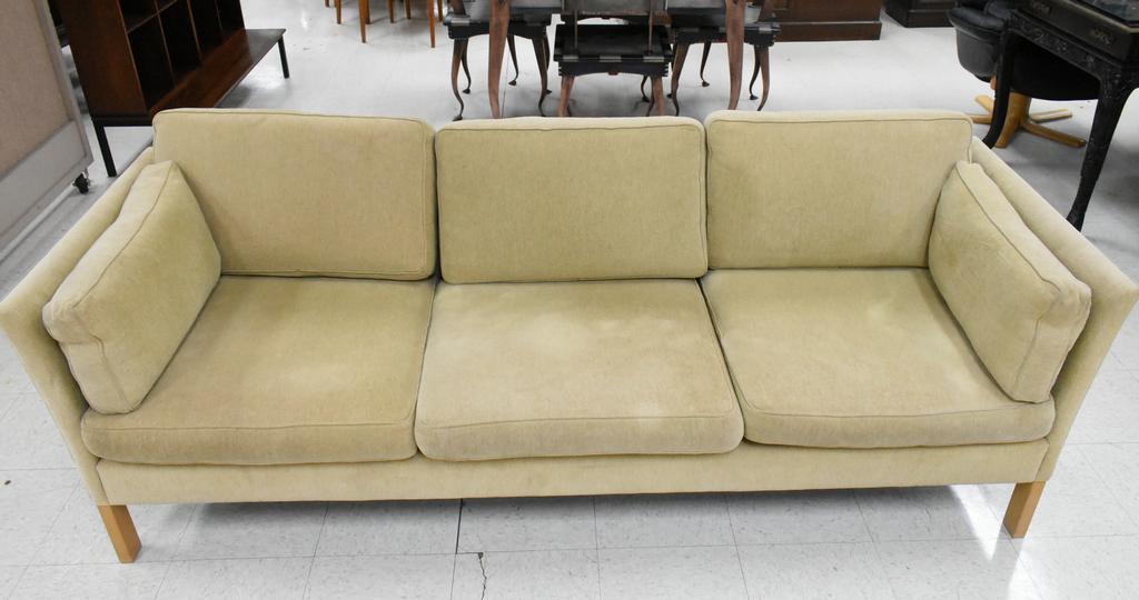 Modernist sofa with beige tweed upholstery. 82.25" W, 28.25" D, 29" H.
