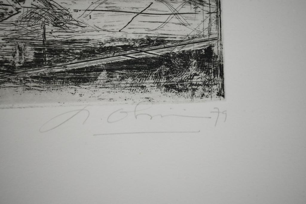 Nathan Oliveira (1928 - 2010), Aquatint and drypint etching, Emerson Site I. Signed, #40/40, dated 79. 3EP LTD blind stamp. Image: 4" x 7", paper: 22" x 15". Framed. Overall: 24 3/4" x 17 1/2".