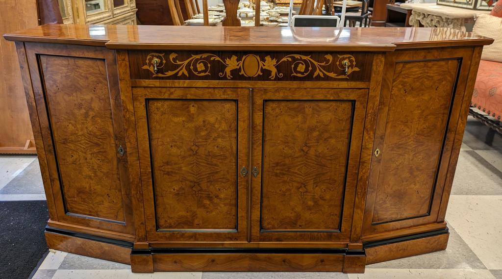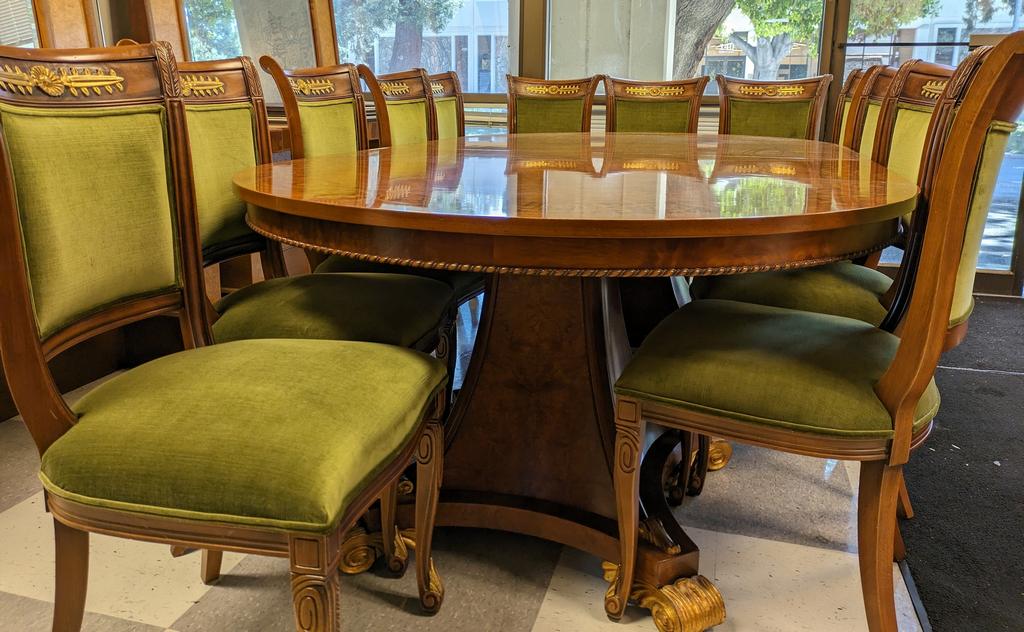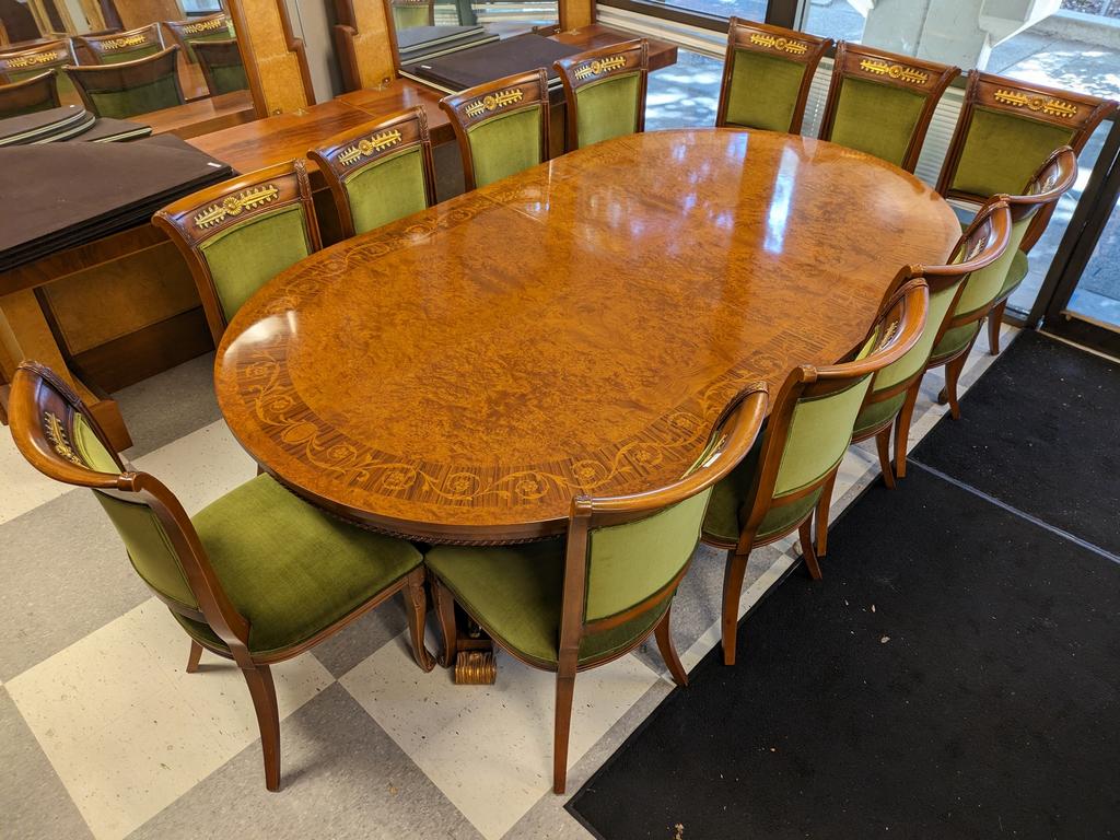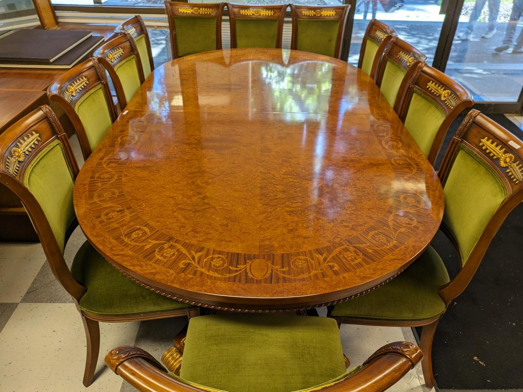 New Empire Collection burl wood dining suite. Double pedestal dining table with 2 leaves and 12 chairs: 4-door, single drawer sideboard, 8-door china cabinet with 2 glass doors. Table with gilt paw feet, chairs with green velvet upholstered seats and gilt decoration on the head rest.