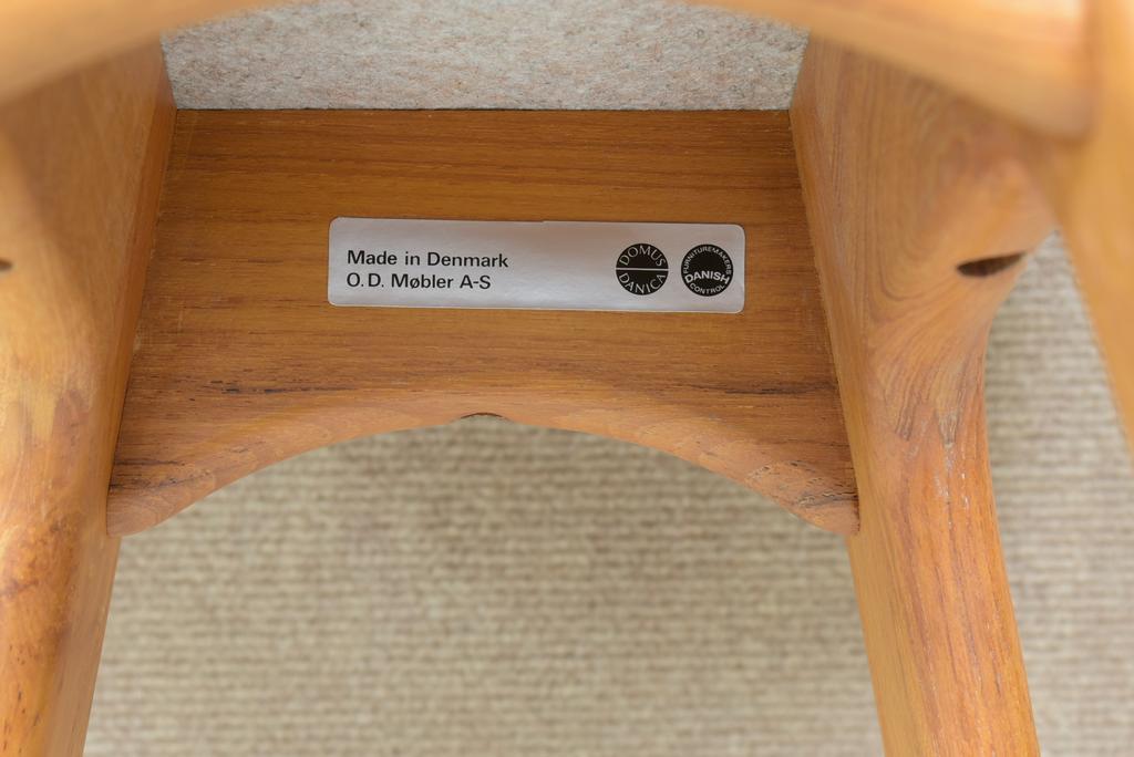 O.D. Mobler Danish teak stool with leather seat. Erik Buch model 61 style. O.D. Mobler label with Domus Design and Danish Furniture Makers Control marks. 15.5" W, 17.5" D, 33.25" H.