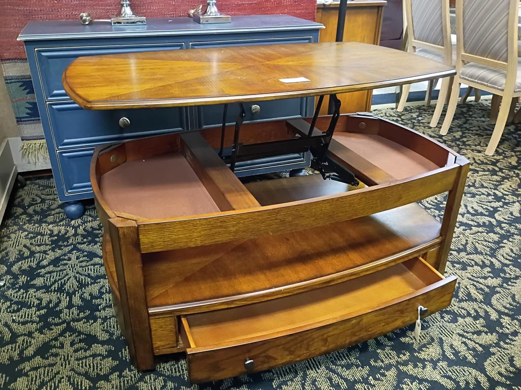 Oak Coffee Table With Lift Top Storage, Lower Shelf And Single Drawer.