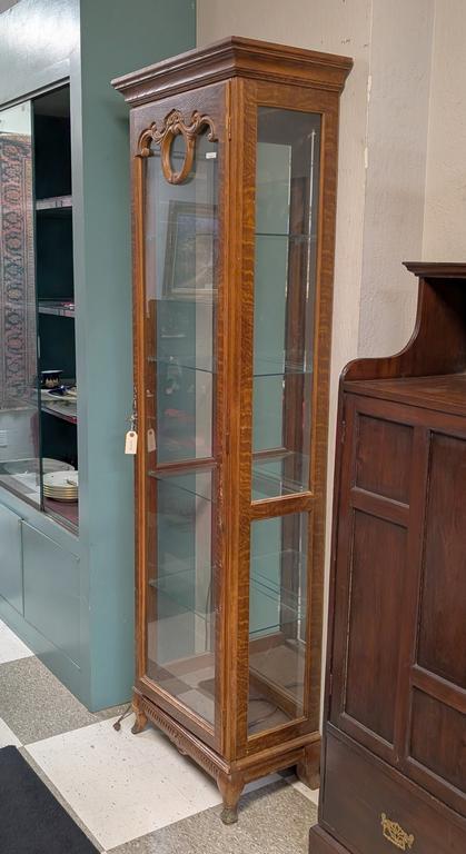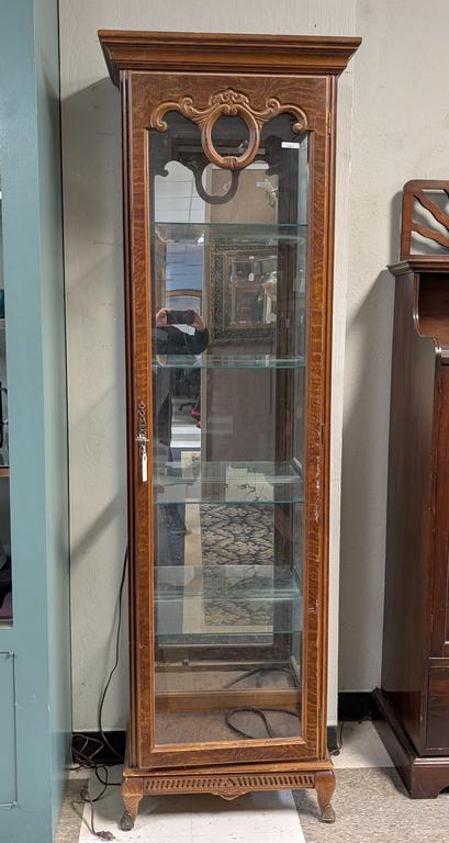Oak and glass door display tall cabinet with 4 glass shelves. 24" W, 15" D, 82" H.