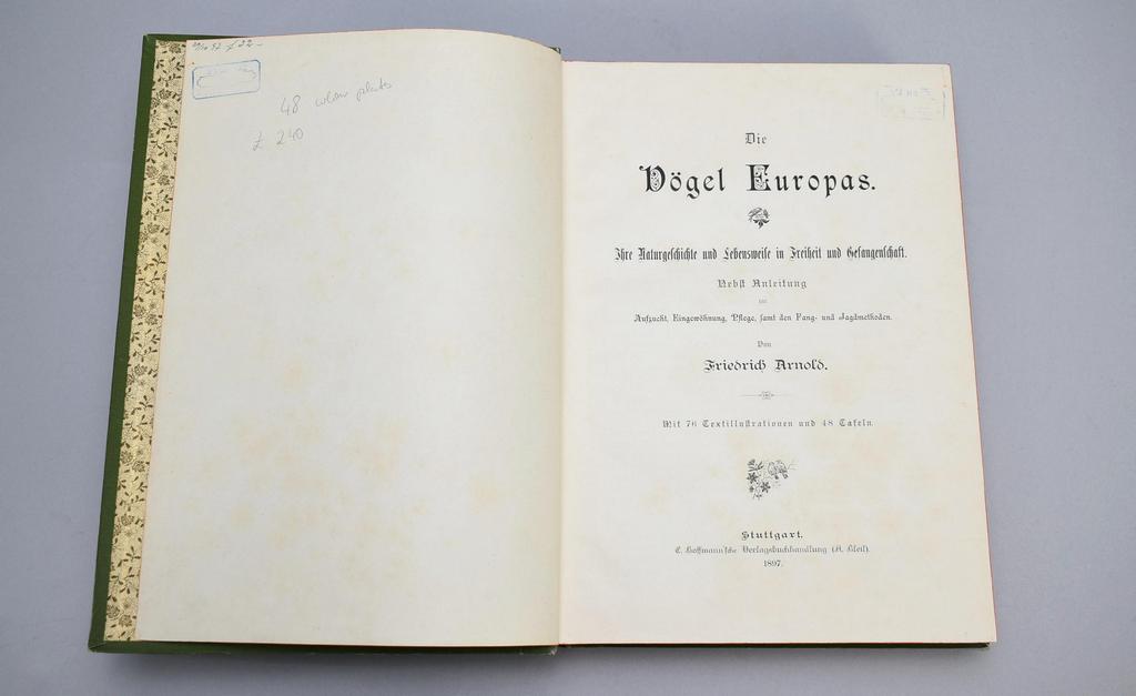 One Volume, Die Dogel Europas (Birds of Europe) by Friedrich Arnold, Stuttgart 1897. With 48 plates of birds and eggs.