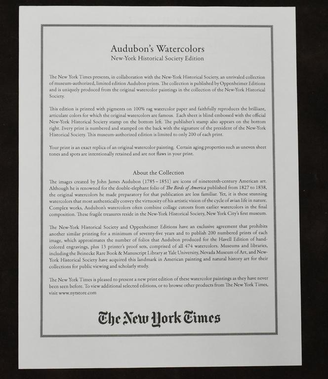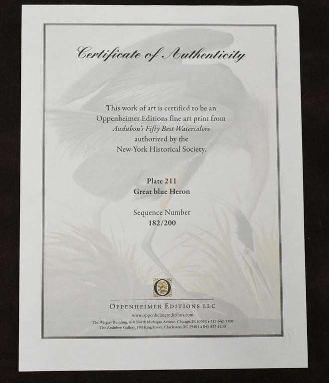 Oppenheimer Editions Blue Heron print, Plate 211. Audubon's Fifty Best Watercolors. The New-York Historical Society edition. Embossed stamp on the folio and print. Image: 36" x 25.25". With Oppenheimer Editions LLC Certificate of Authenticity Plate 211, Edition 182/200.