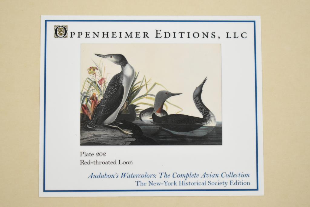 Oppenheimer Editions Red-throated Loon print, Plate 202. Audubon's Watercolors: The Complete Avian Collection. The New-York Historical Society Edition. Embossed stamp on the folio and print. Image: 21.5" x 29.5".