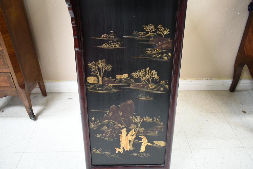 Oriental altar style 2-door cabinet with 2 lower drawers. Gilt painted landscape decoration on the front, sides and top. 32" W, 15" D, 36 3/4" H.
