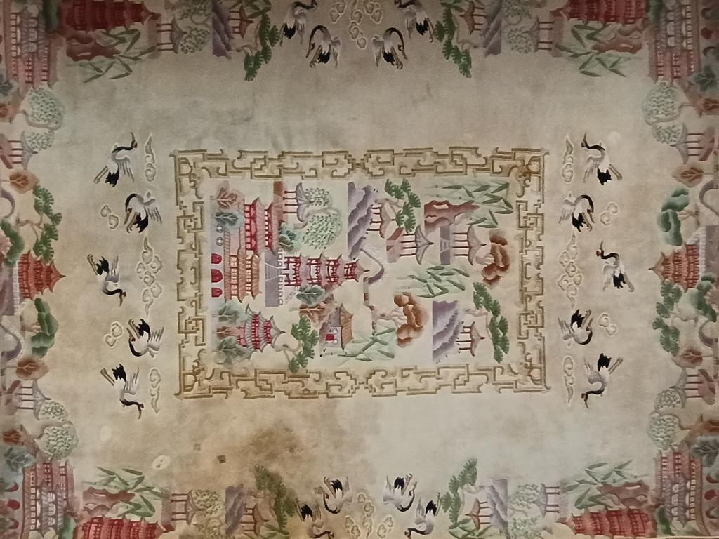 Oriental beige wool pile rug. Landscape, pagoda and crane decoration. 12' x 9'.
