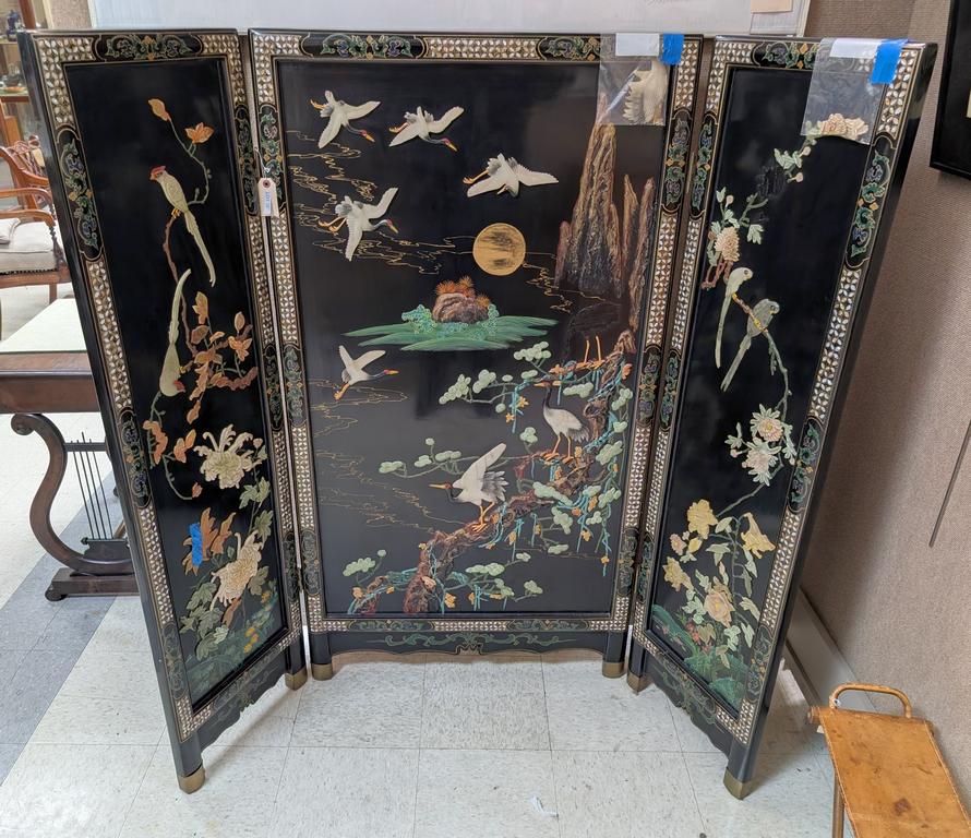 Lot 241: Oriental Black Lacquered 3-Panel Screen