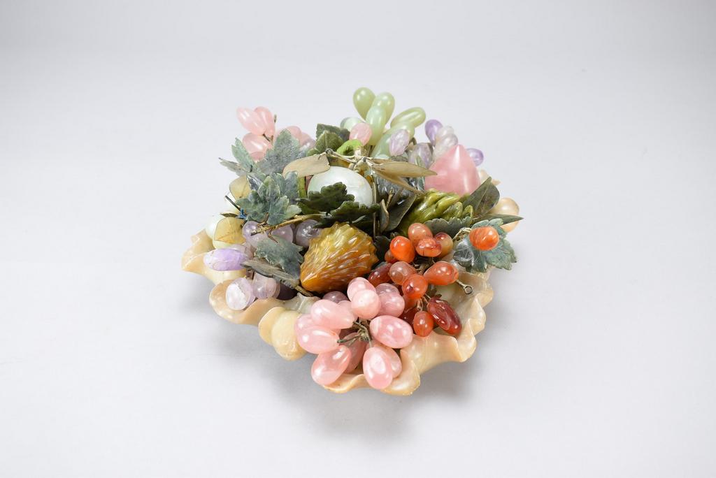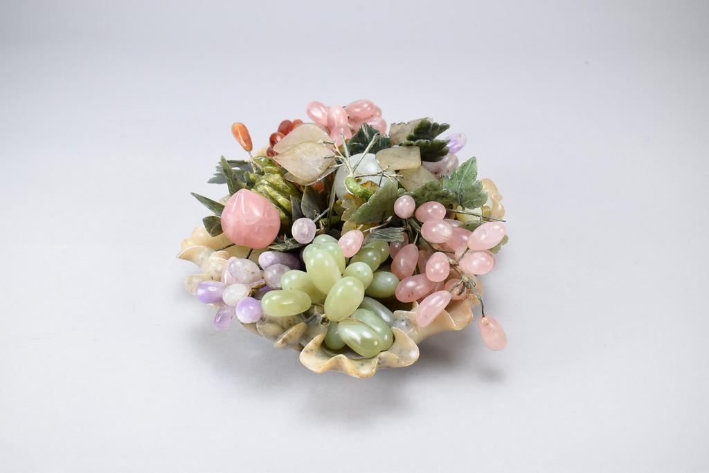 Oriental carved soft stone bowl with hard stone fruit arrangement. 16" x 11.5" x 4.5".