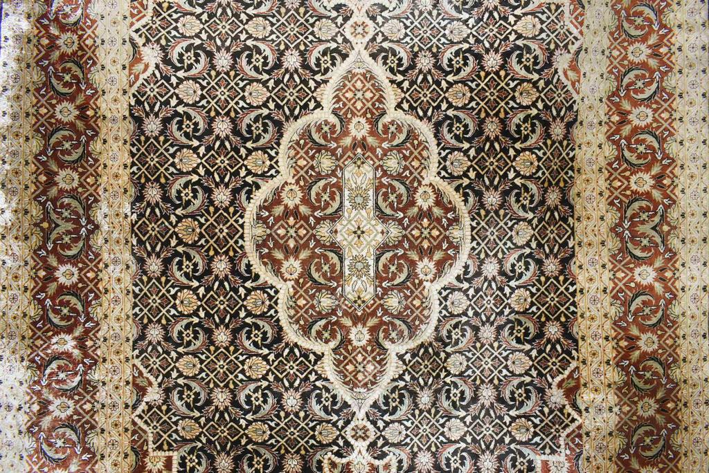 Oriental Hand Knotted Silk Rug. Brown Ground With Center Medallion, Spandrels, Floral Decoration. 6'2" X 4'1".