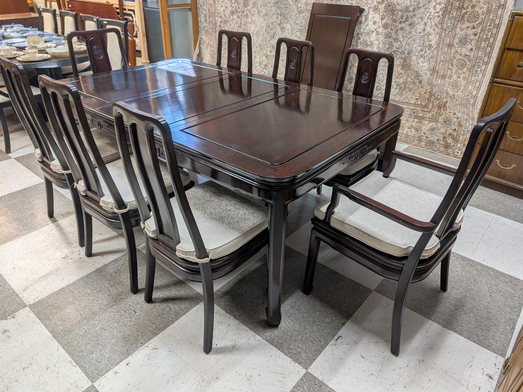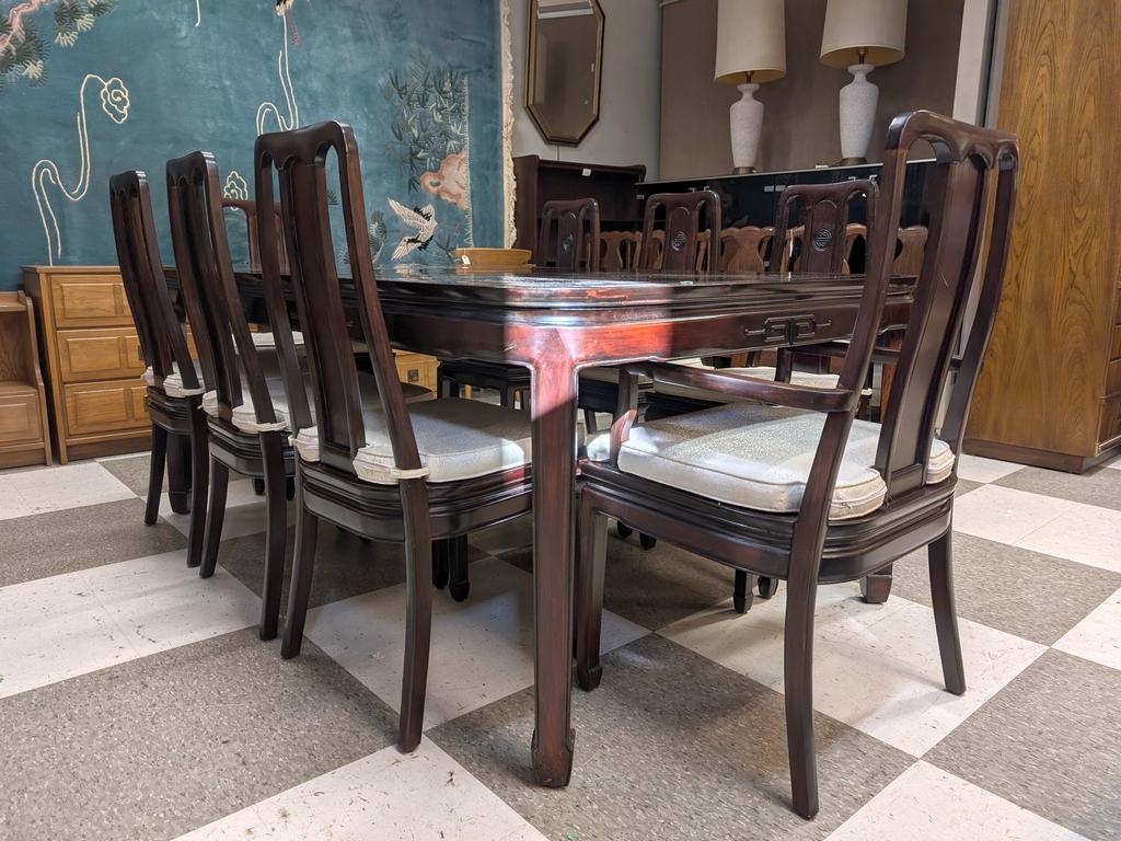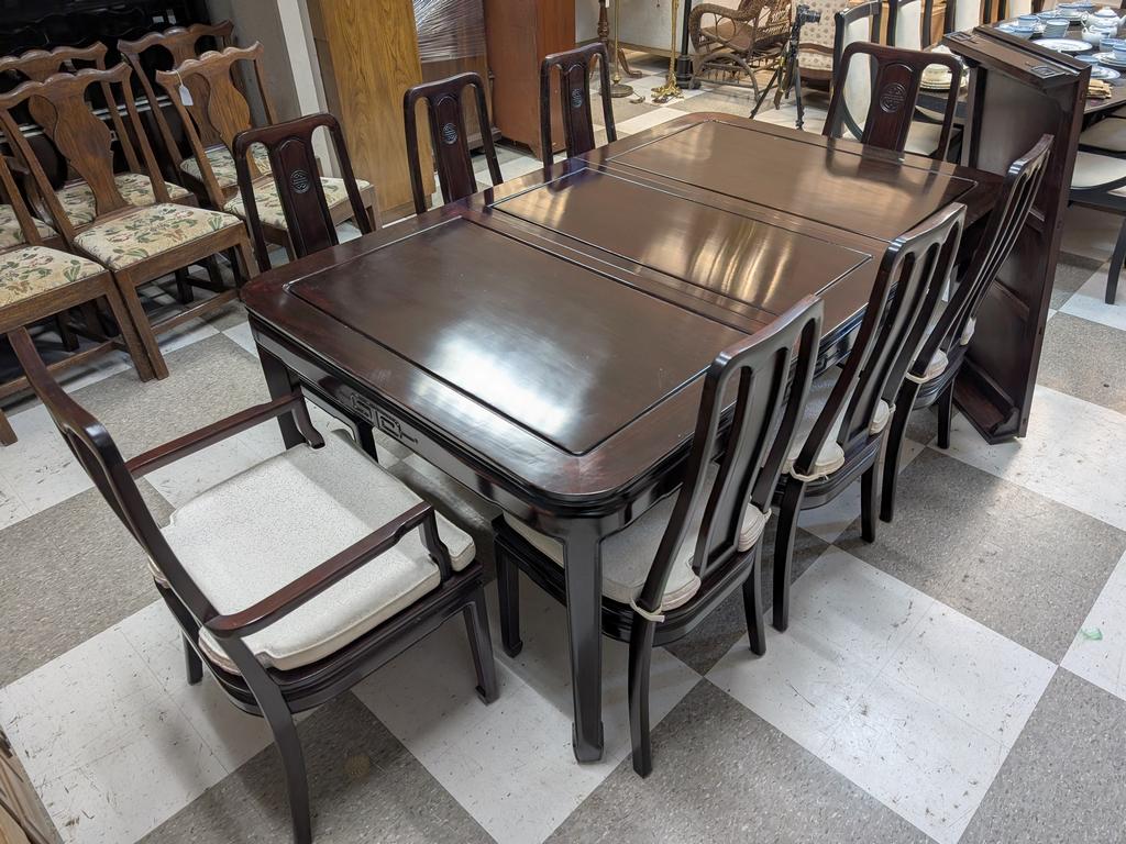 Oriental Hard Wood Dining Table With 2 Leaves, 6 Chairs, Lazy Susan & Custom Glass Top.