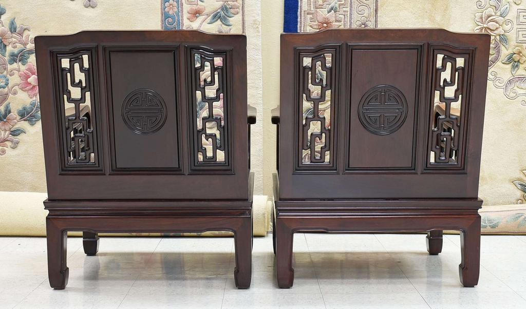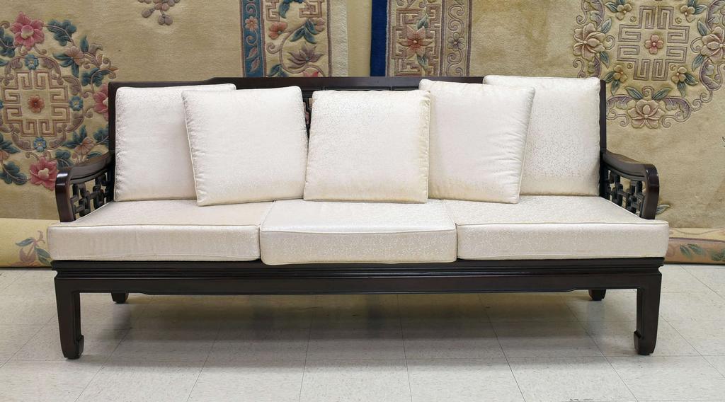 Oriental Rosewood Plank Seat Sofa And 2 Armchairs With Open Work Decoration. With Silk Covered Cushions.