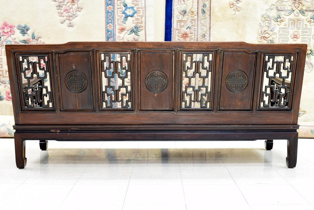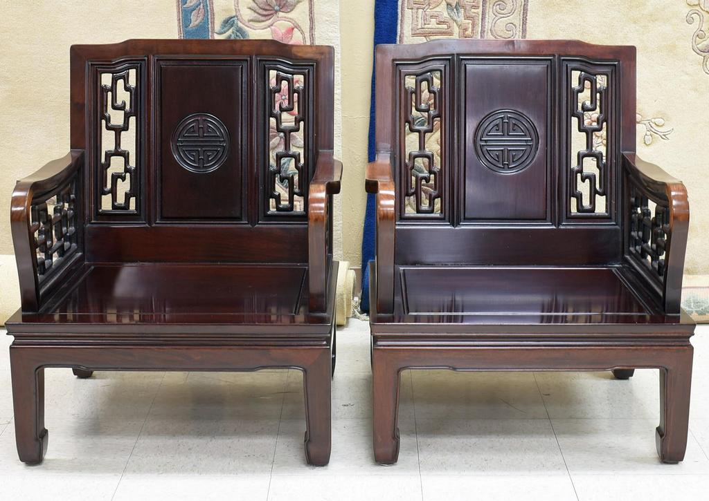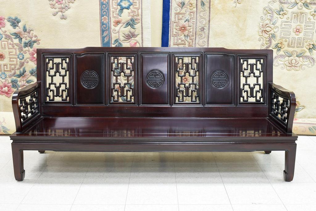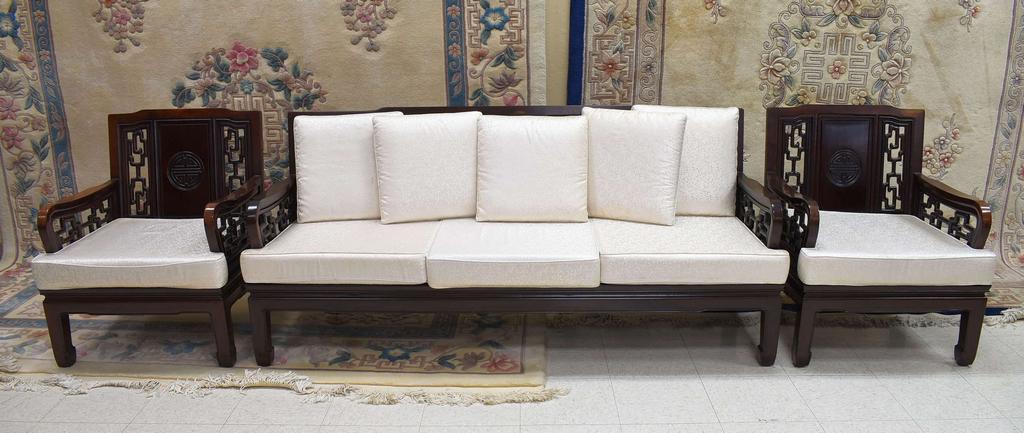 Oriental Rosewood Plank Seat Sofa And 2 Armchairs With Open Work Decoration. With Silk Covered Cushions.