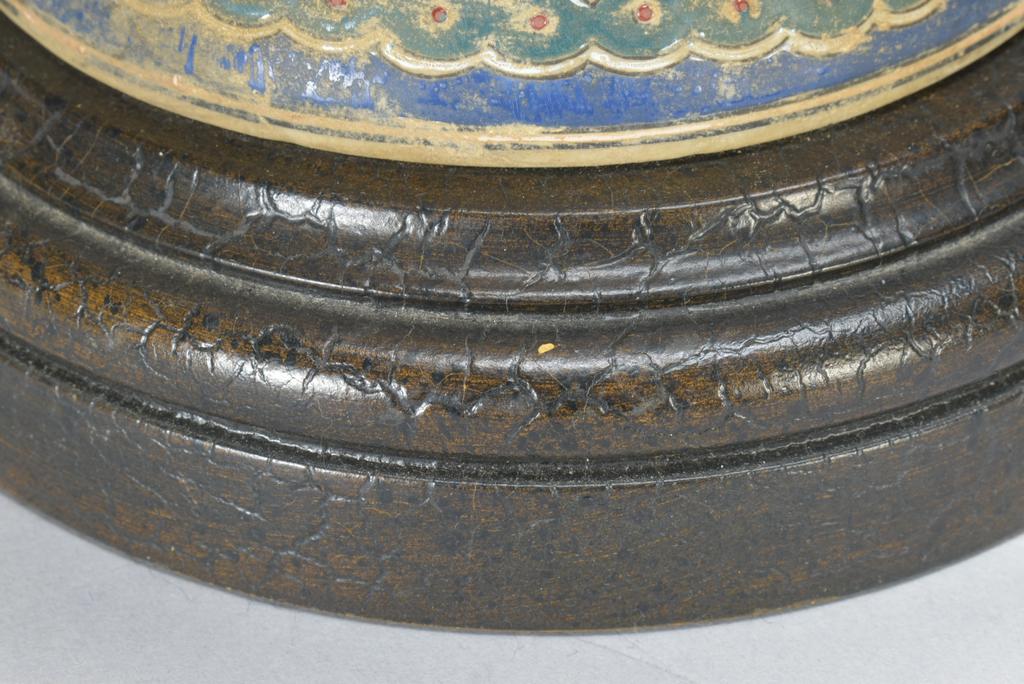 Oriental style ceramic table lamp. Polychrome ceramic vase with 2 gilt handles, modified as a lamp. With a later base and top. No shade. Overall: 31" H, 8" W. Losses to paint.