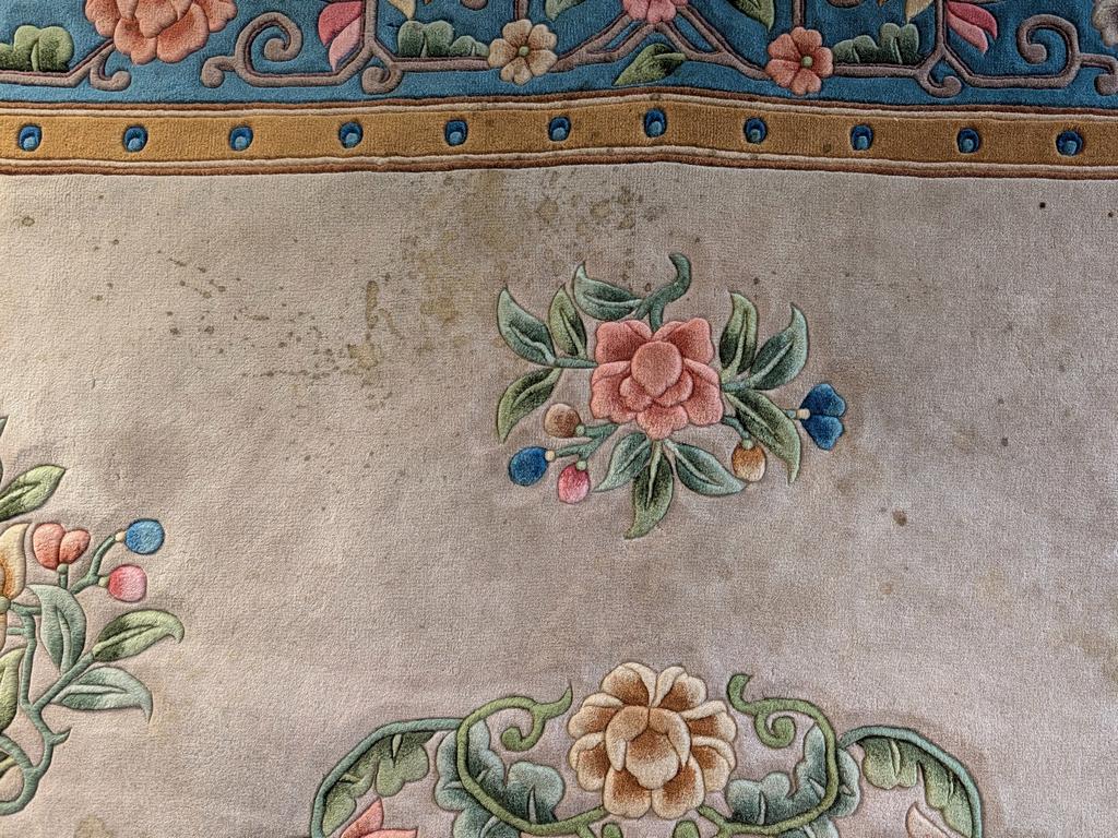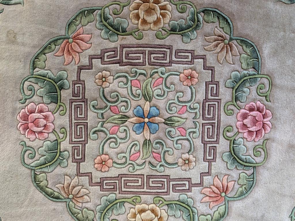 Oriental Wool Pile Rug. Beige Ground With Center Medallion, Floral Decoration, Blue Border. 12' X 9'.