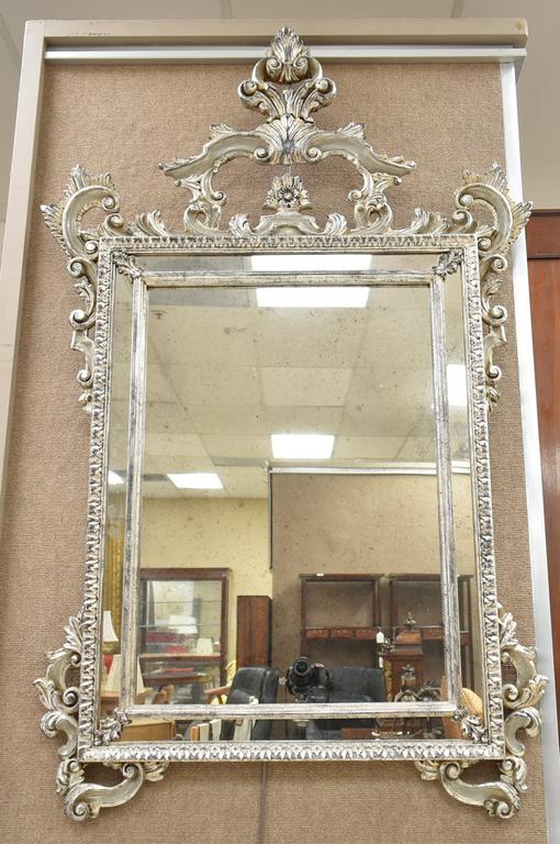 Ornate silver gilt framed mirror with carved crest, shoulders and sides. Overall: approx. 53" x 36".