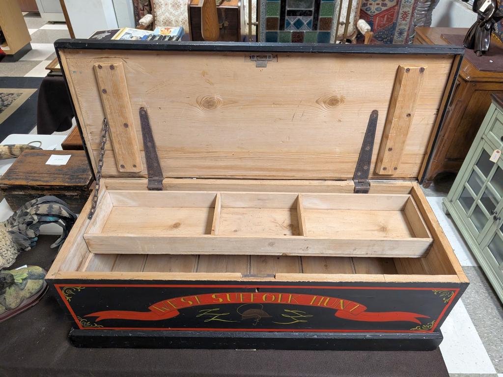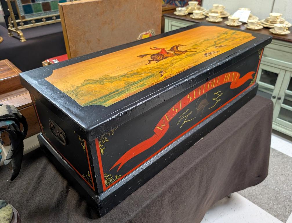 Painted Carpenter's Chest With Fox Hunt Motif. "West Suffolk Hunt". 37" W, 14.5" D, 12" H.