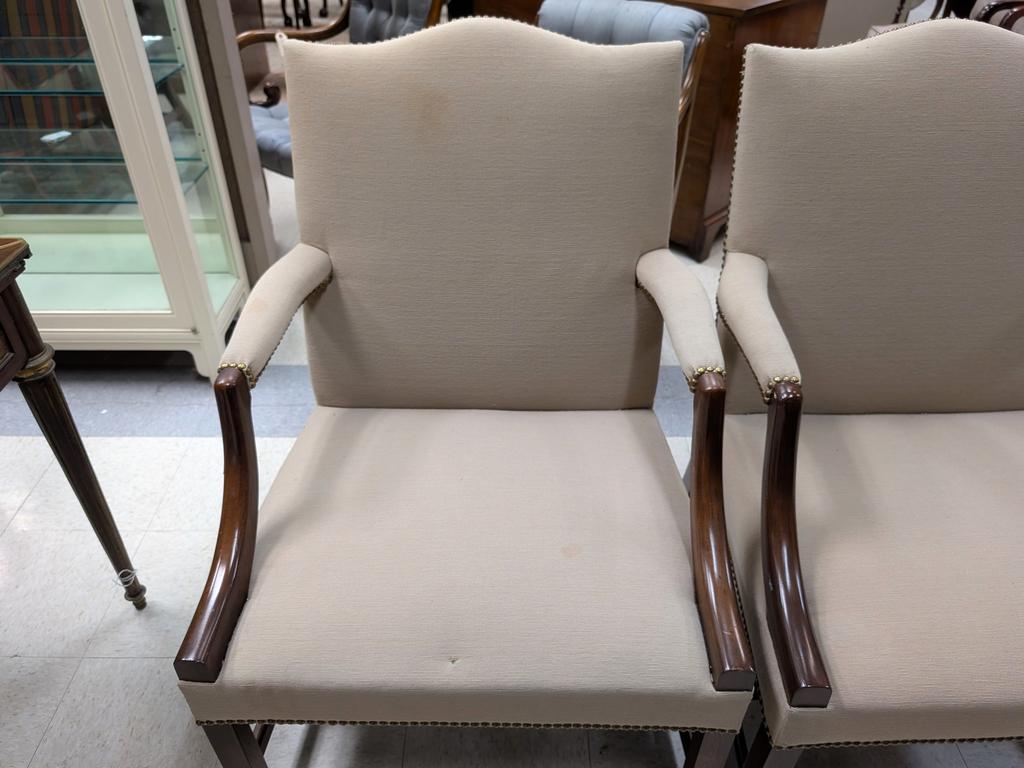 Pair Of Beige Upholstered Armchairs. Wood & Hogan NY Retailers.