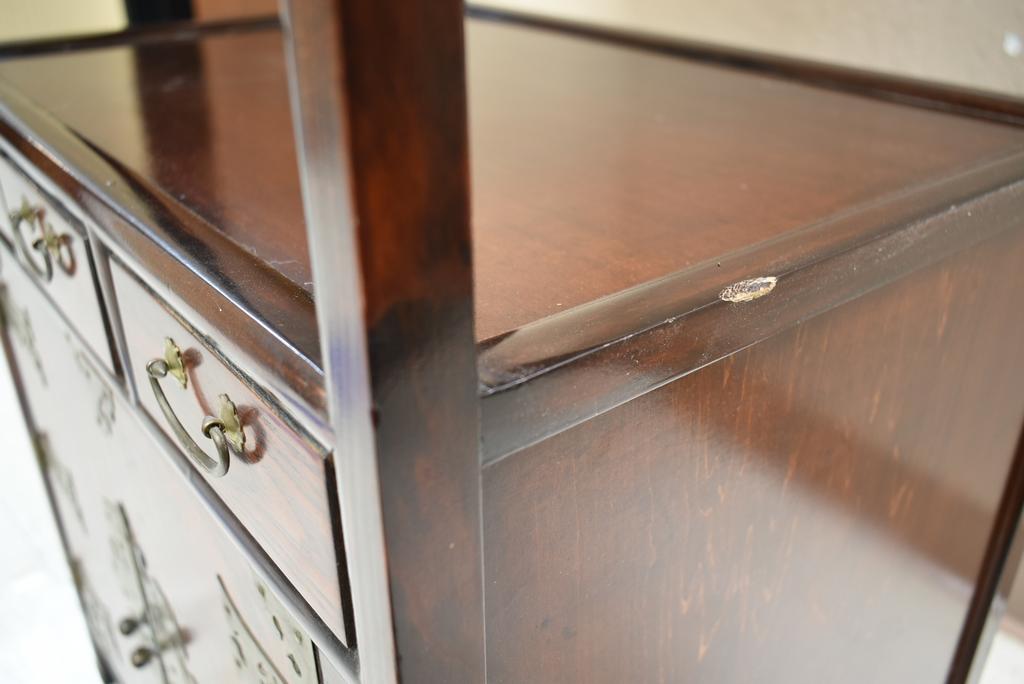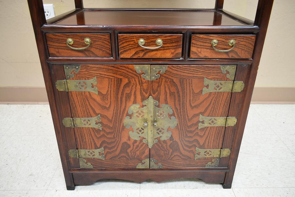 Pair of Chinese elm tall etageres with 3 shelves, 2 doors, and 6 drawers. Brass handles, locks and adornments. Overall: 23 1/2" W, 16"D, 66" H.