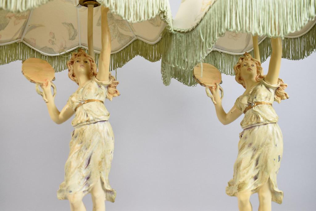 Pair of Collection Francaise painted metal figural table lamps in the form of a woman holding a tambourine. With tasseled shades. Overall: 32" tall. Collection Francaise stamp.