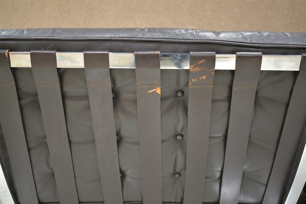 Pair of Industria Argentina "Barcelona" style chairs. Chrome base with leather cushions. Marked Industria Argentina. 31" W, 33.5" D, 31.5" H.