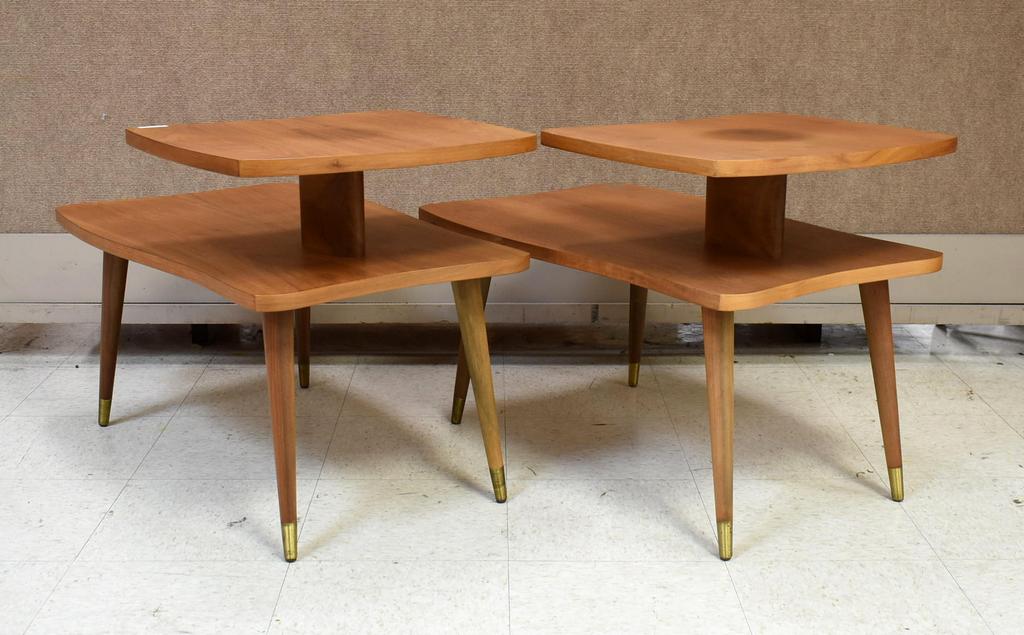 Pair of mid century walnut 2-tier side tables. 32.5" W, 20" D, 22.5" H.