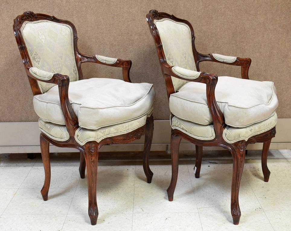 Pair of provincial style oak armchairs with grey silk upholstery and cushions. 24" x 24" x 36.