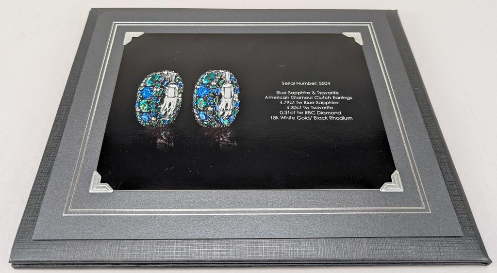 Pair of Robert Procop American Glamour earrings. Stamped 18K, RP 5504. Clutch earrings containing 56 prong set, round cut natural sapphires, 40 graduated, prong set, oval cut natural sapphires. Total weight on natural sapphires 4.79 carats; 58 prong set, round cut tsavorite garnets, 40 prong set oval cut natural tsavorite garnets. Total weight on natural tsavorites 4.30 carats. Accented by 30 prong set, round brilliant cut diamonds. Hinged with snap in posts measuring 0.92" x 0.75" & 6.6 mm wide, weighing 19.2 grams. Diamonds: approx. 0.31 ctw, E-F, VVS1. With Robert Procop Certificate.