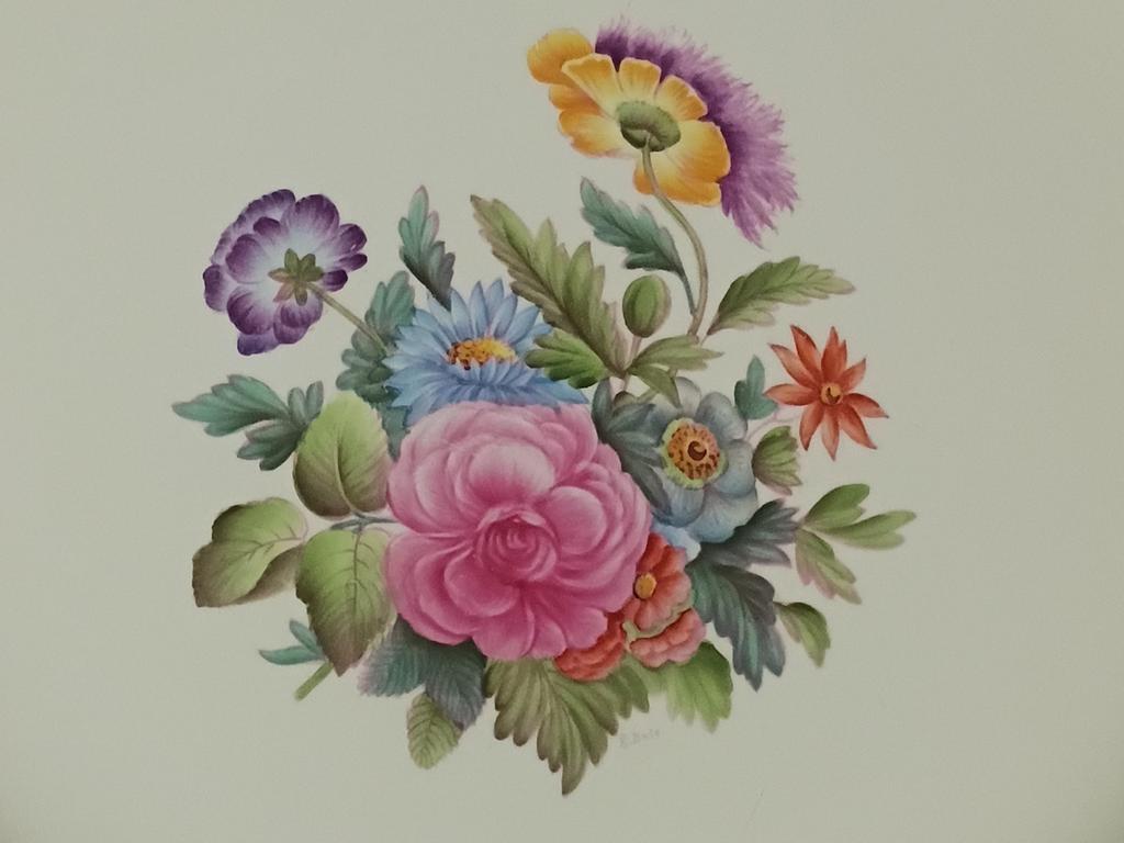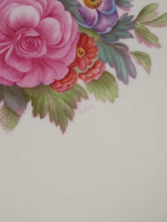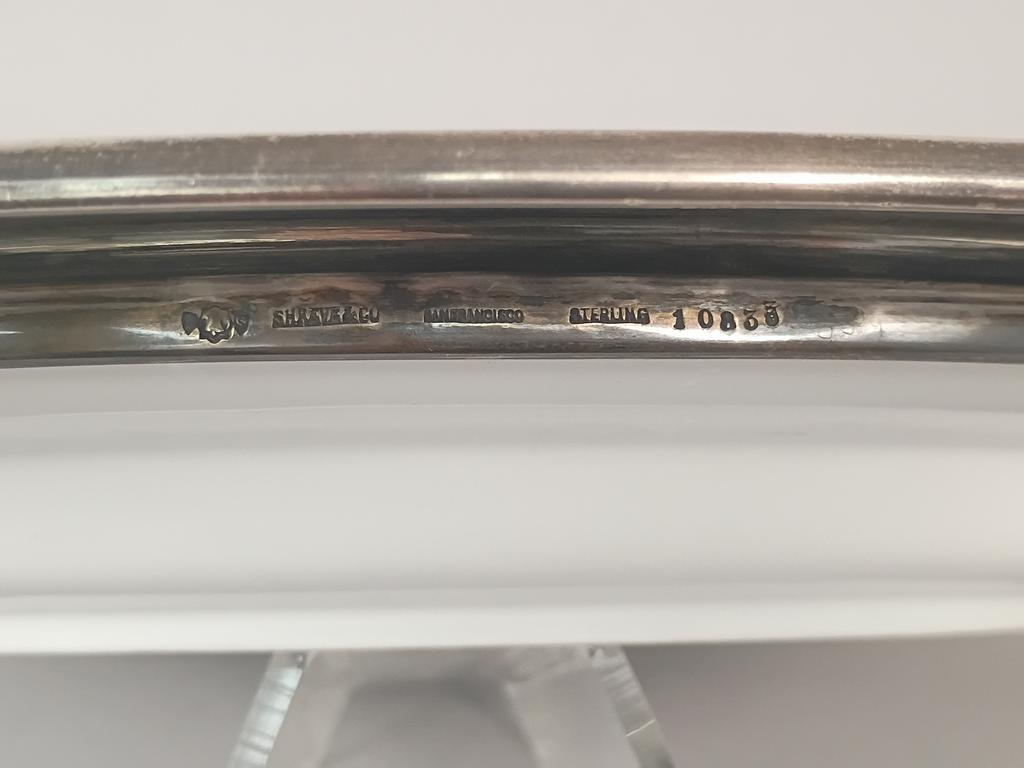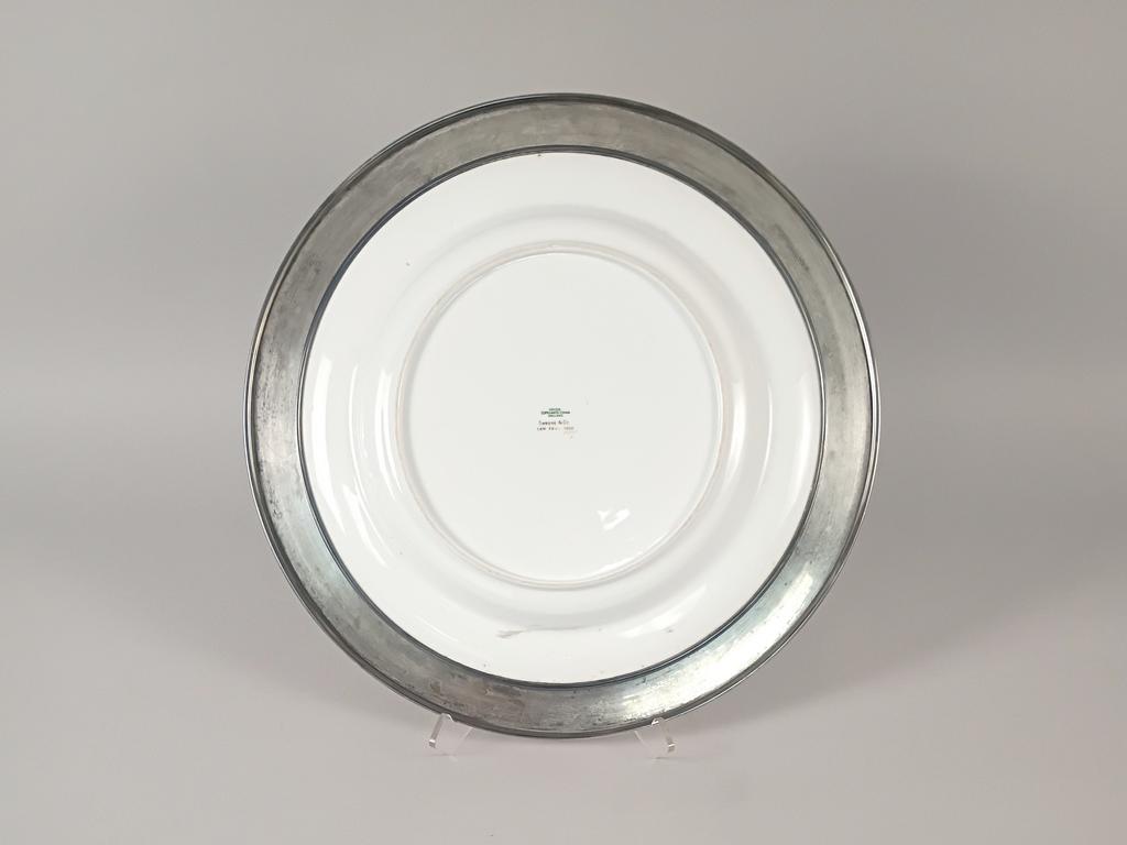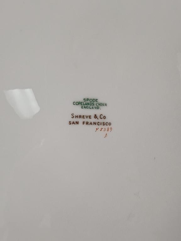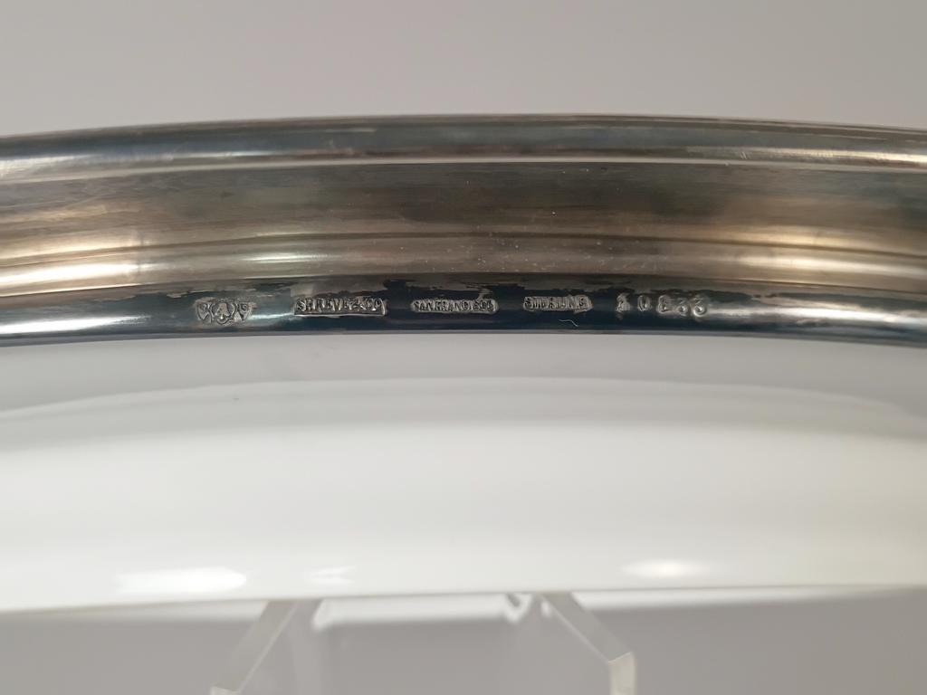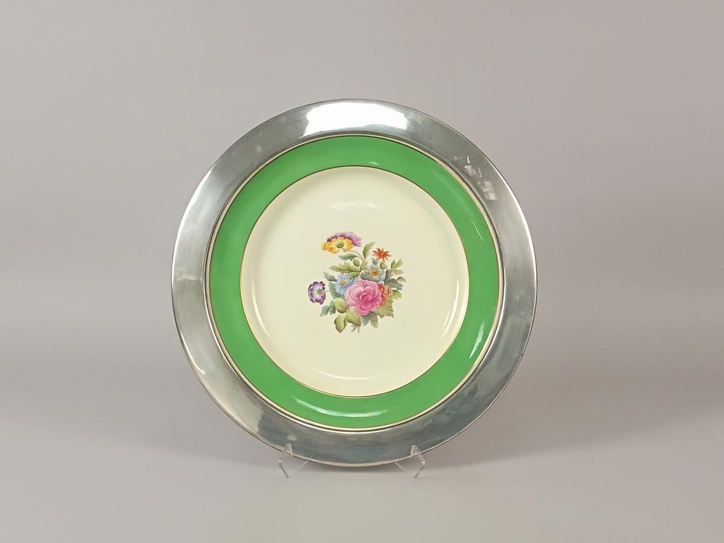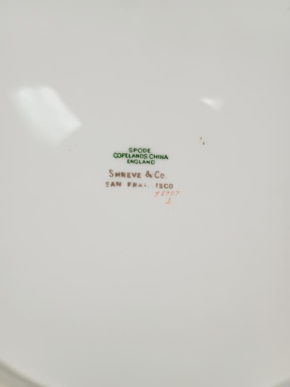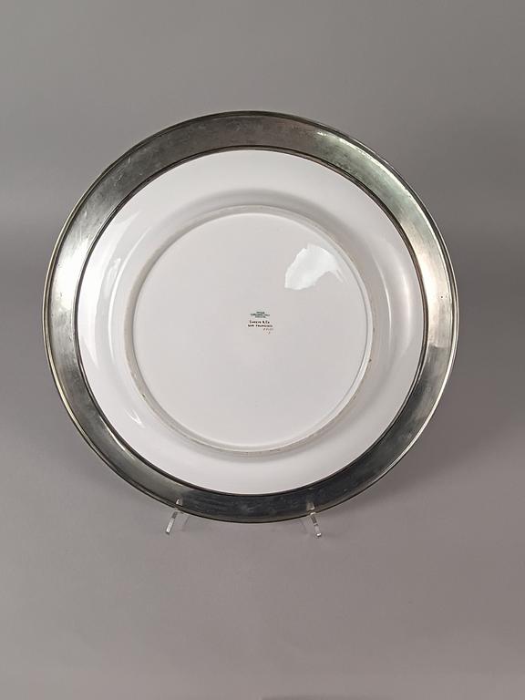 Pair of Shreve & Co. Sterling Silver mounted Spode Copeland chargers with central floral spray, red and green borders. 17" diameter.