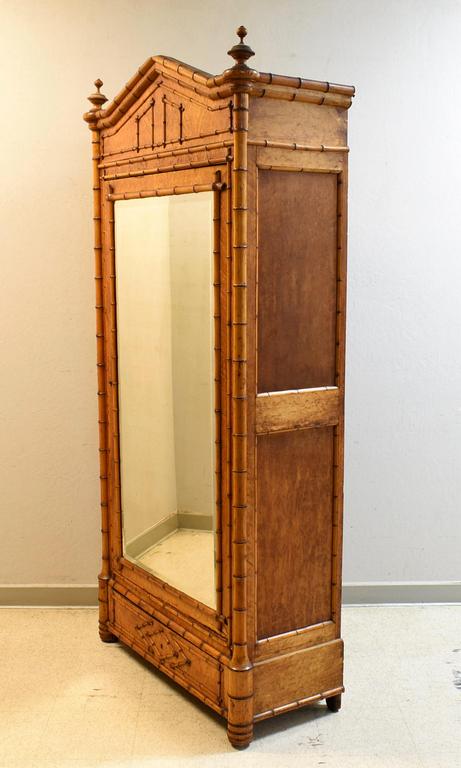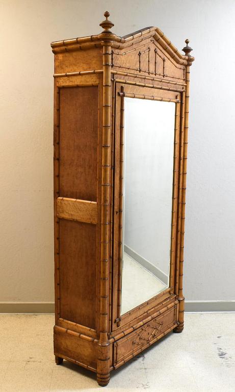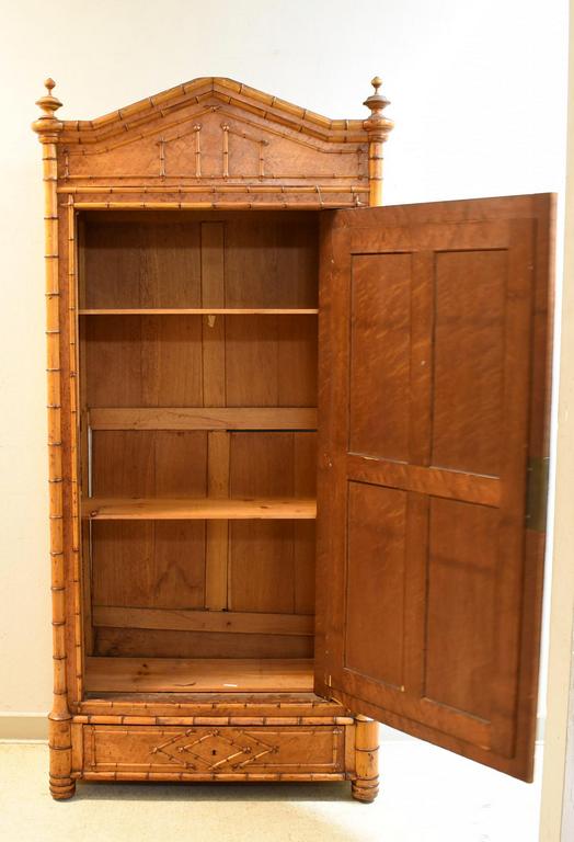 R. J. Horner style faux bamboo, bird's eye maple, aesthetic movement wardrobe with beveled mirrored door. Circa 1900. 41" W, 17" D, 85" H.