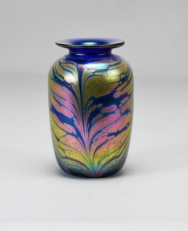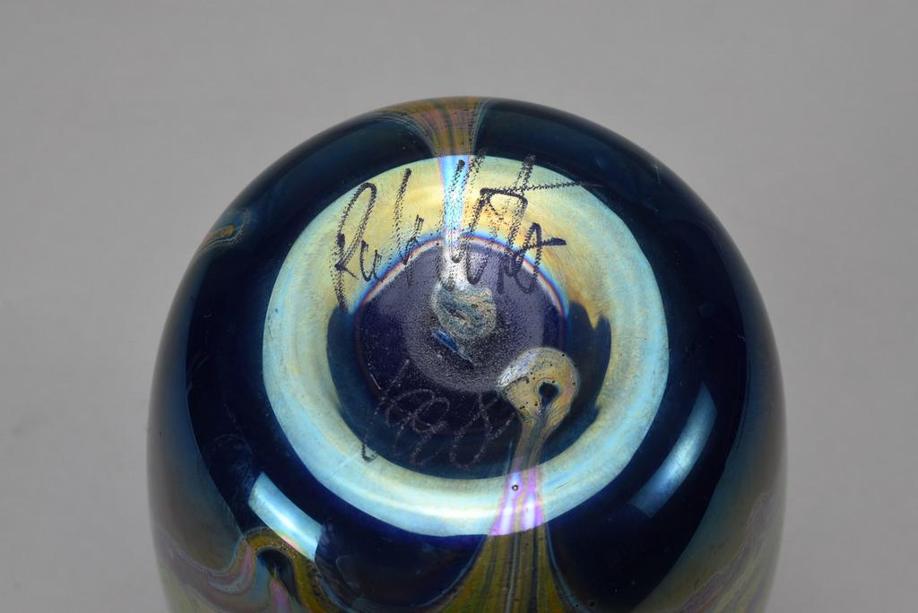 Rick Hunter art glass vase. Blue body with iridescent gilt design. Signed, dated 1998. 6 1/4" tall.